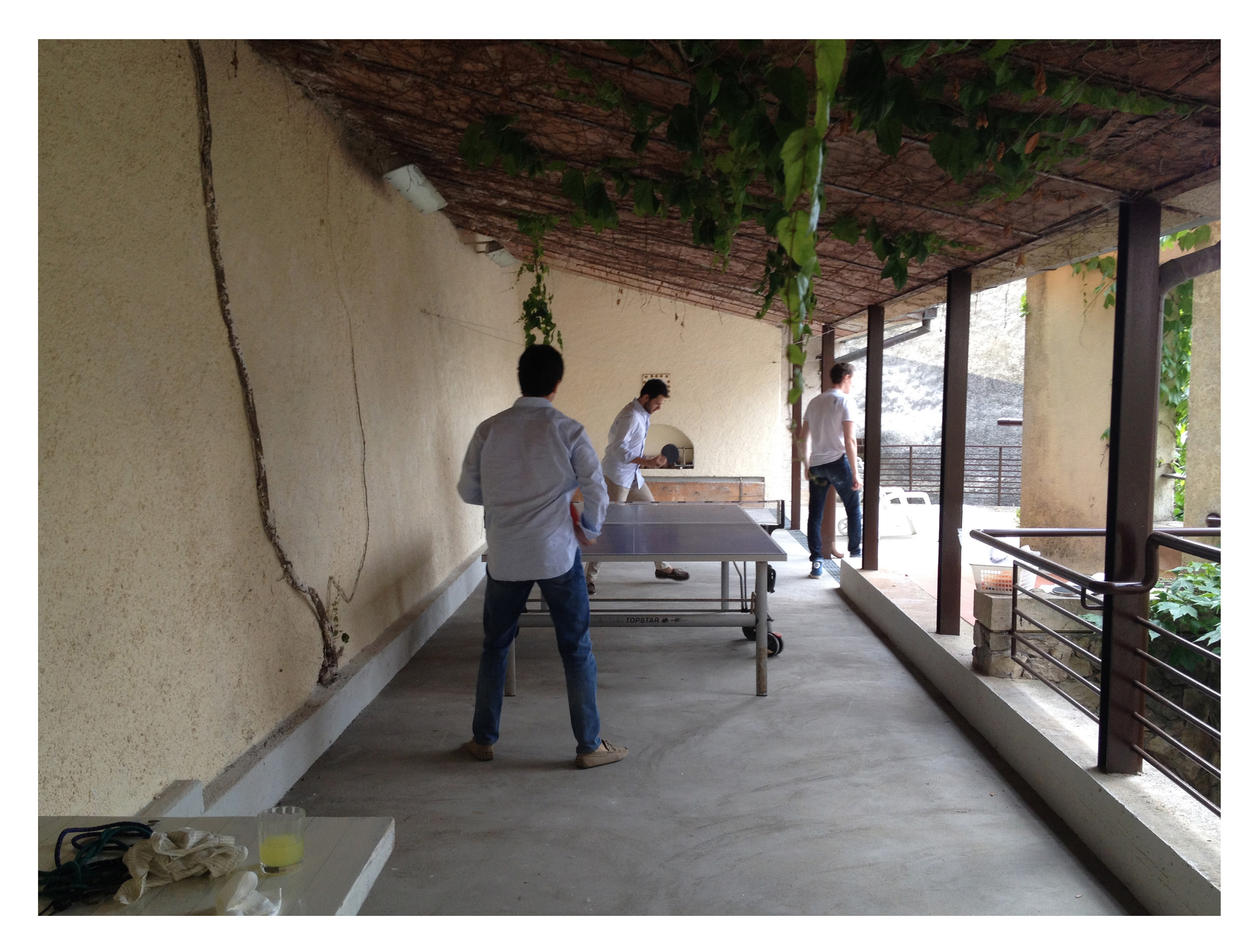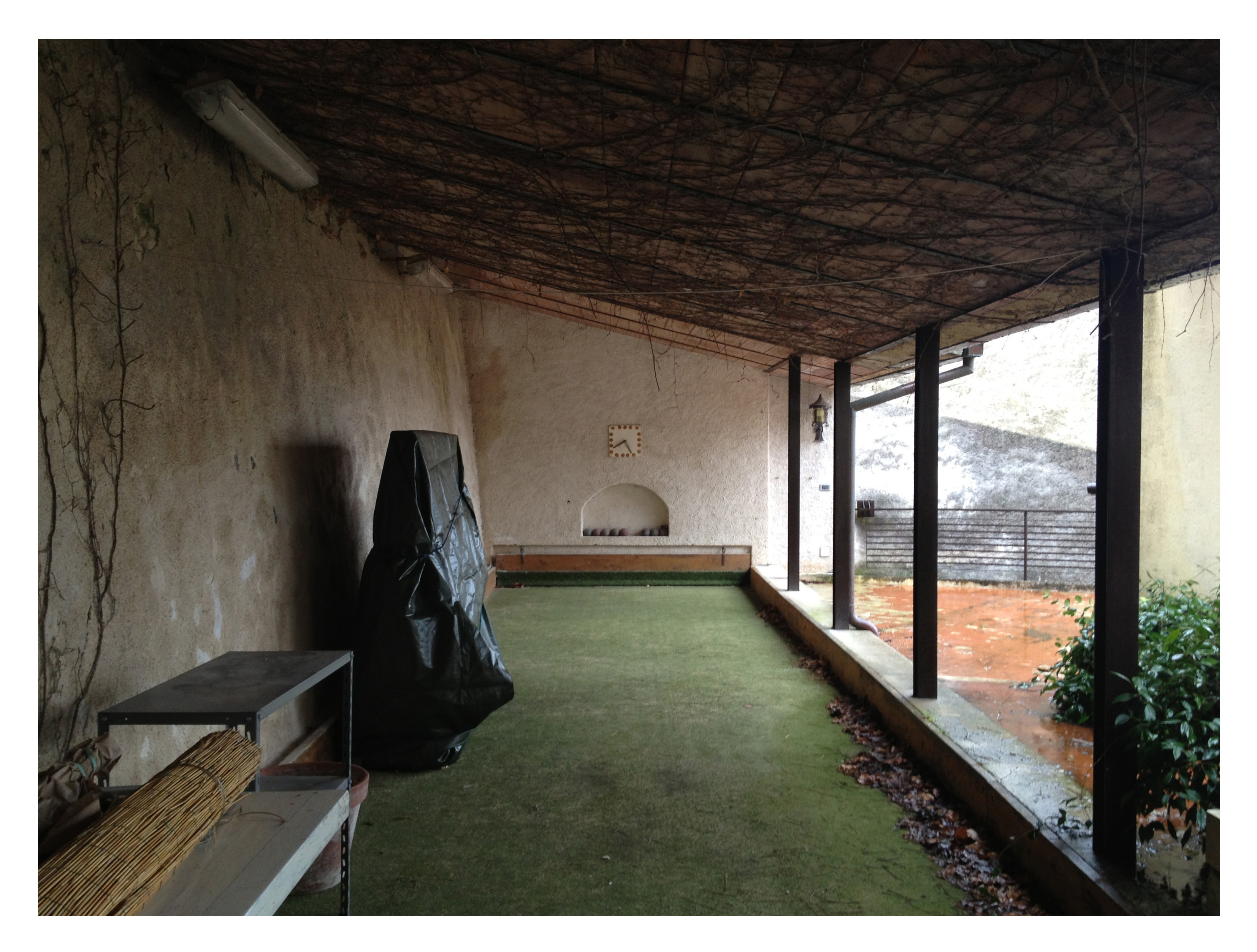 La ristrutturazione di un bocciodromo dismesso all’interno di un’abitazione privata a Paganico Sabino si è rivelata una preziosa occasione per cogliere la dimensione più autentica dell’attività progettuale. La nuova destinazione d’uso, ibrida e variabile rispetto alle stagioni, ha reso necessario uno studio sulle possibilità offerte da uno spazio insolito e fortemente condizionato dalla sua precedente storia. E’ stato proprio il tentativo di non smarrire la memoria del luogo, la sua peculiarità, a muovere le scelte di questo intervento. Il lavoro, svolto con la collaborazione delle maestranze locali, ha come elemento caratterizzante la nuova pavimentazione in cemento a vista, con stampi in ferro, lavorati artigianalmente ed annegati nello spessore del piano di calpestio, ultimi testimoni di una partita ancora da raccogliere.