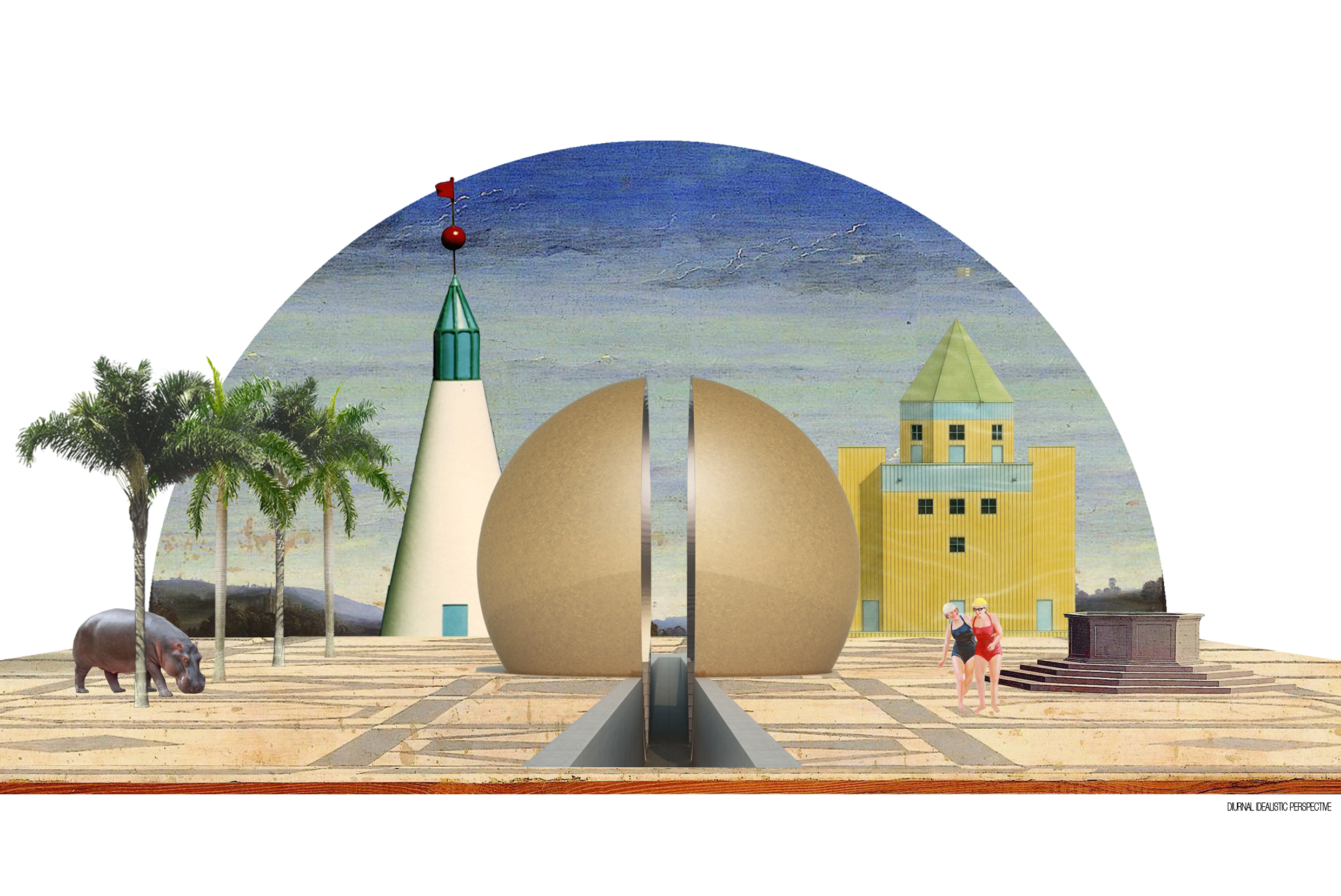 Partendo da questa analisi, sentiamo il bisogno di accettare la sfida di progettare un monumento alla democrazia. Lo facciamo senza rinunciare a quella vocazione propedeutica e rappresentativa che ogni buon monumento dovrebbe custodire. Prima la forma: la democrazia, nella sua accezione universale, liberatrice, condivisa, pura, non può non ricondursi che a una sfera. Ma troppo spesso le forme si sono isolate, come torri d’avorio, dai loro contenuti. Nella nostra sfera presso Kavajë ciò non potrà accadere. Perché la sfera è stata attraversata. La sottrazione di un parallelepipedo dall’elemento puro, bronzeo, consente l’attraversamento della sfera. Il suo uso si completa e si sostanzia per mezzo di uno spazio assembleare interno alla forma sferica. I diversi individui raccoltisi nei due emicicli si confrontano. Nello stesso tempo si specchiano, non solo gli uni negli occhi degli altri, ma anche sulla superficie specchiata interna alla sfera. Questo elemento risulta di particolare importanza poiché aspira a far vivere la democrazia in chi la abita, ammonendo ogni individuo della propria presenza, fondamentale, dentro la sfera.