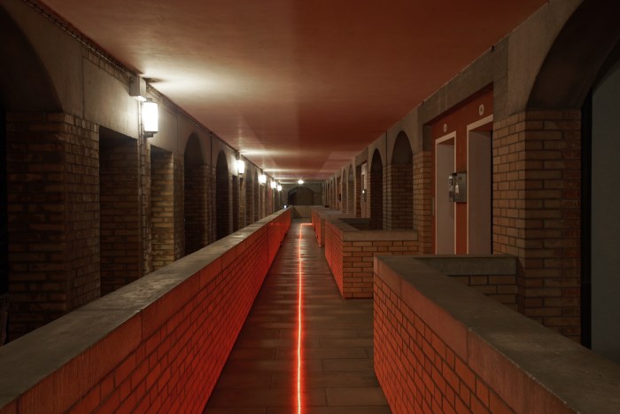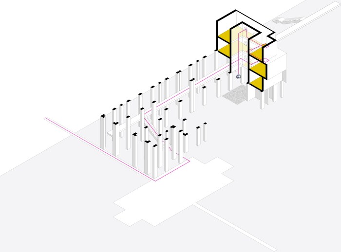 The proposal imagines the temporary installation of an object able to create interaction and dialogue with the complex spaces of the Giudecca Social Housing. This artifact serves a didactical function, acting as an opportunity to explore, discover, and better comprehend this intricate, late twentieth century architectural masterpiece. Simultaneously, the proposal is intended to recall and evoke the specific historical moment that represents the event’s theme: the 1980’s, birth period of both this housing project and the invited group of authors. These premises materialize in a line, a wire, a cable that will guide visitors through the maze-like areas of Gino Valle’s complex, revoking Ariane’s mythical thread which helped the hero Theseus inside Minos’ labyrinth. To capture the guest’s attention and curiosity, and in order to emphasize the contrast between the sobriety of the buildings and the extraneous item, this “string” will be a glowing, luminescent object that echoes an 80’s glam, flashy feel.