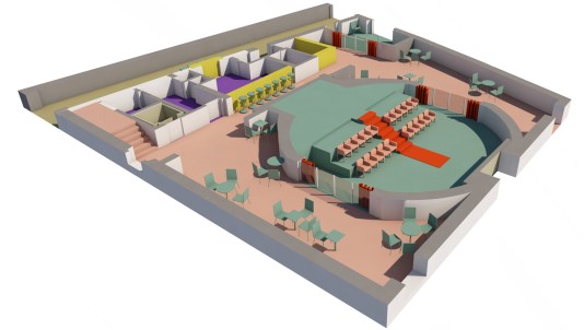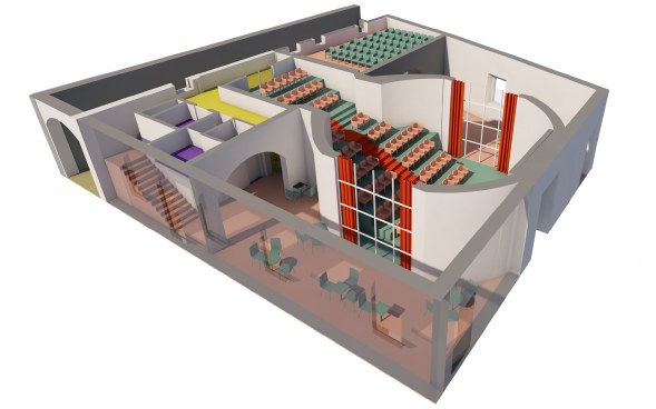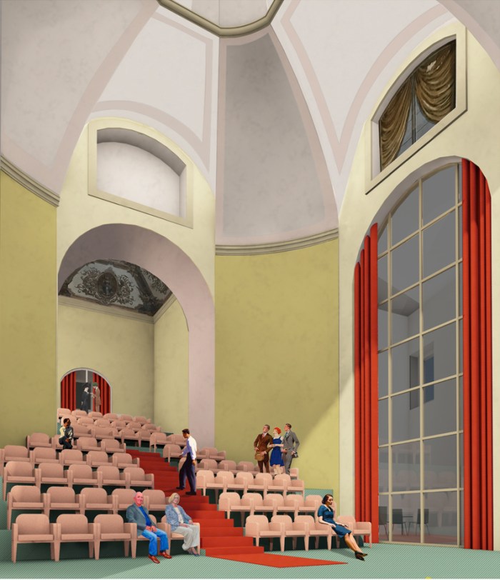 Two movie theatres and a multifunctional room. The main theatre will be characterized by a stepped structure, enriched by the vaults of the church dome and the apse, in an elegant context suitable to enjoy films, theatrical performances, scenic readings, and musical concerts. The second room, on the upper floor, will be dedicated to specific groups of publics: children, schools, cine clubs, and amateur groups interested in thematic reviews. A third multifunctional room will offer an easily transformable study room to host training courses and film workshops. On the ground floor, a big foyer will embrace the main room. The project for the Cinema Bambi, through an unusual imaginative journey, will have a great responsibility, both civic and cultural at the same time: to bring citizens closer to the deconsecrated church of San Nicolò – to its construction, to its most intimate nature, making possible to observe and live in the church from an unusual point of view.