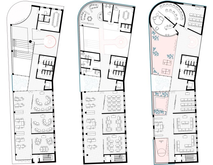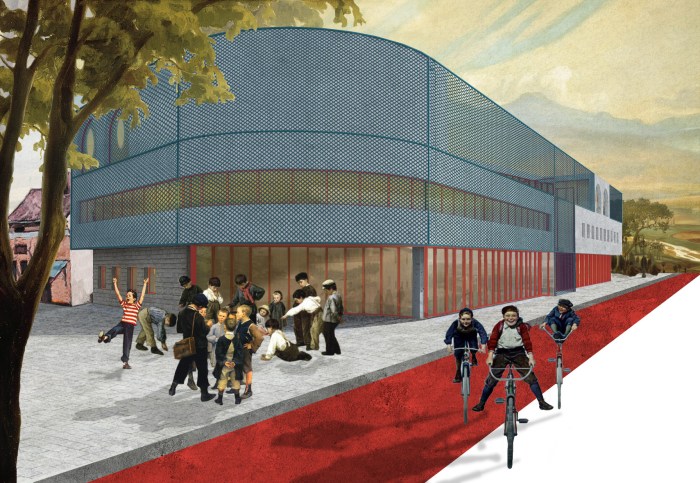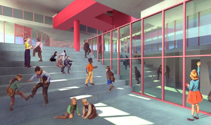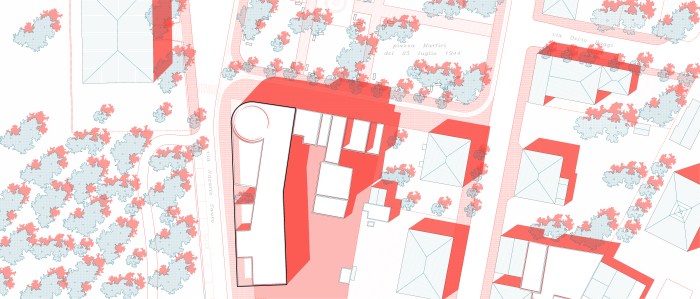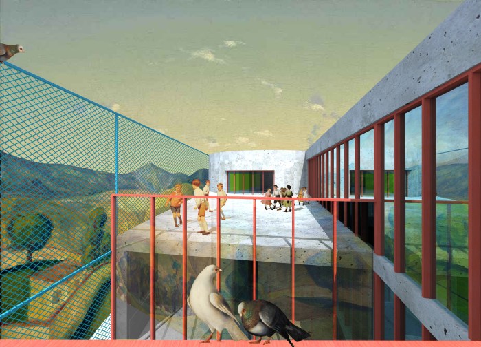The project is born in dialogue with the urban core of San Piero, mending Martiri Square in an organic though not submissive way. The ground floor façade pays homage to the local sandstone while a new concrete structure covered with metal mesh stands upon the stone basement, emphasized by the cylindrical volume in the corner which hosts the library and the laboratories. The volume traces the lot, shrinking in correspondence with the sheltered entrance which invites the citizens to perceive the atrium as a public place. A massive staircase, understood as an internal square, a classroom-staircase, a theater that connects the ground floor and the basement, guarantees a collegial atmosphere. The strategy develops coherently on the three levels above ground: a multifunctional and interactive part facing north and a south exposed area used for daily teaching activities. An outdoor playground on the rooftop is ideal for recreating but offers also a 360-degree view of the mountains all around.