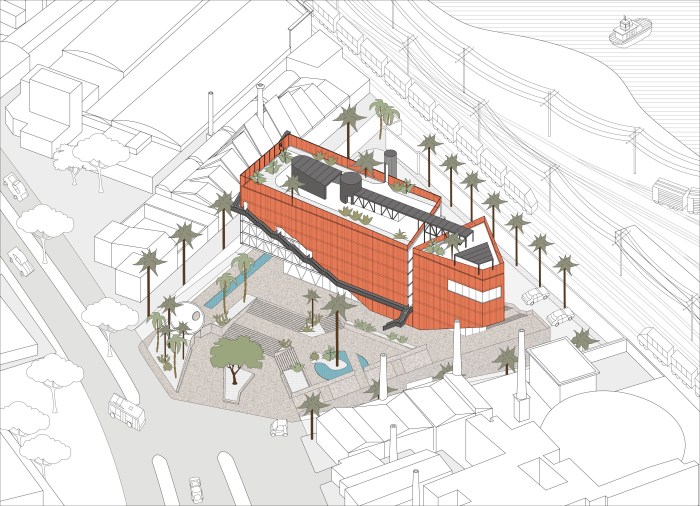 Like a marine creature, maybe interstellar, seems approaching the enigmatic stone – cutiliscio – by Giacomo Leone, on which it directs its glance. The great court, whose main character lies in the renewed balance between the city and the Ionian Sea, will have a red cladding, nourished with anthracite shades, typical of the Etna sand. Through its symbolic value, aims to become a landmark for Catania which generates itself from its remote lava roots.