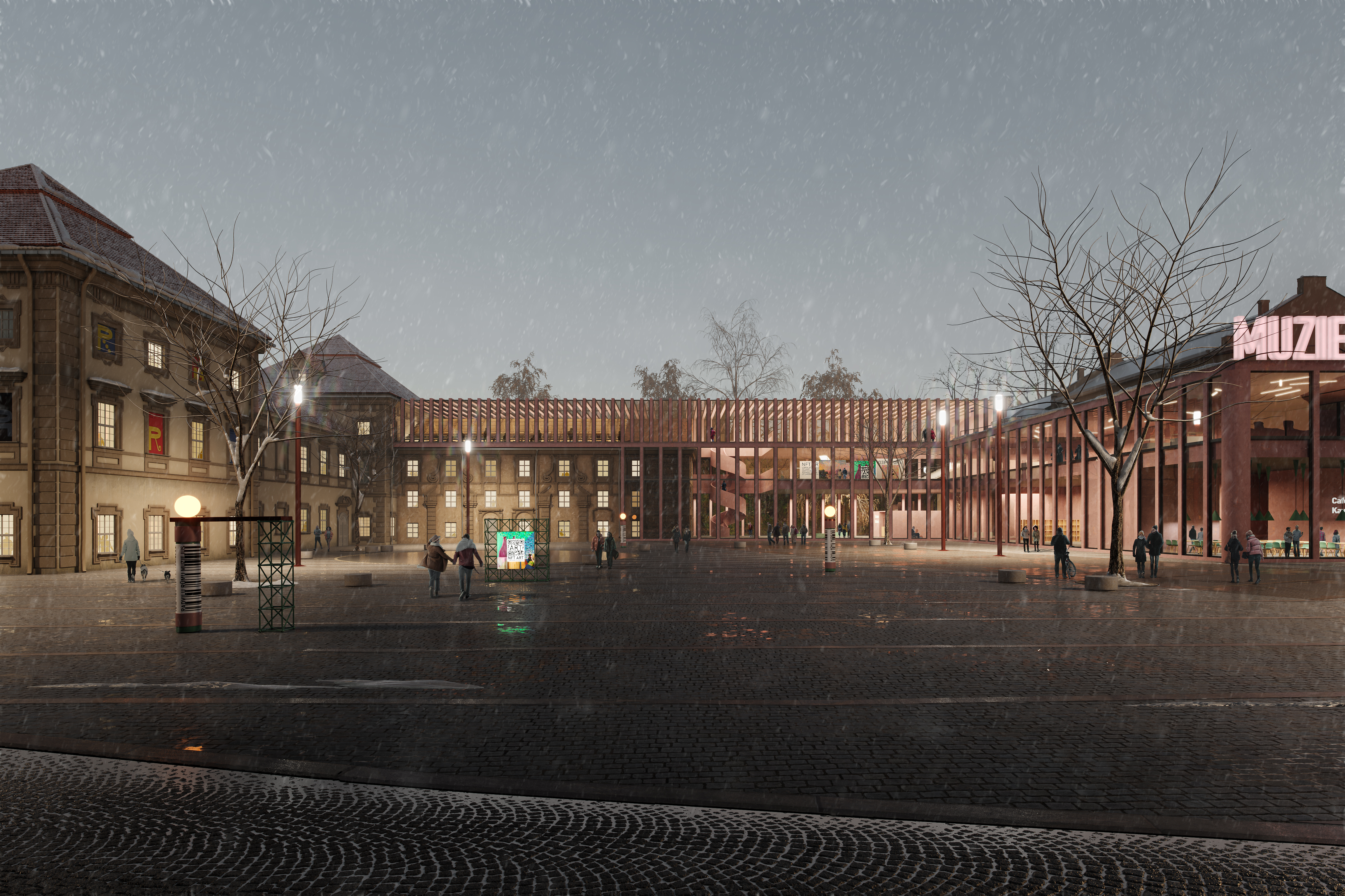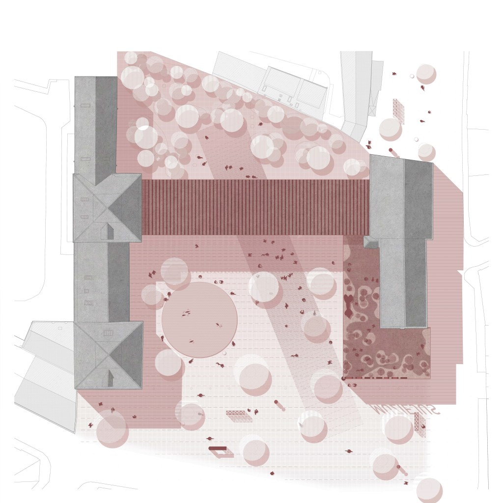 The purpose of the proposal is not to emerge from the historical urban context as an alien intervention, in terms of shape and space, but rather to create a rational architecture in natural continuity with the existing palace. The new volume, rigorous and marked by the rhythm of the large columns, is designed in pink pigmented facing concrete, since it best enhances the monolithic vertical elements, echoing the typical tones of the historical urban context and of the preexisting palace.