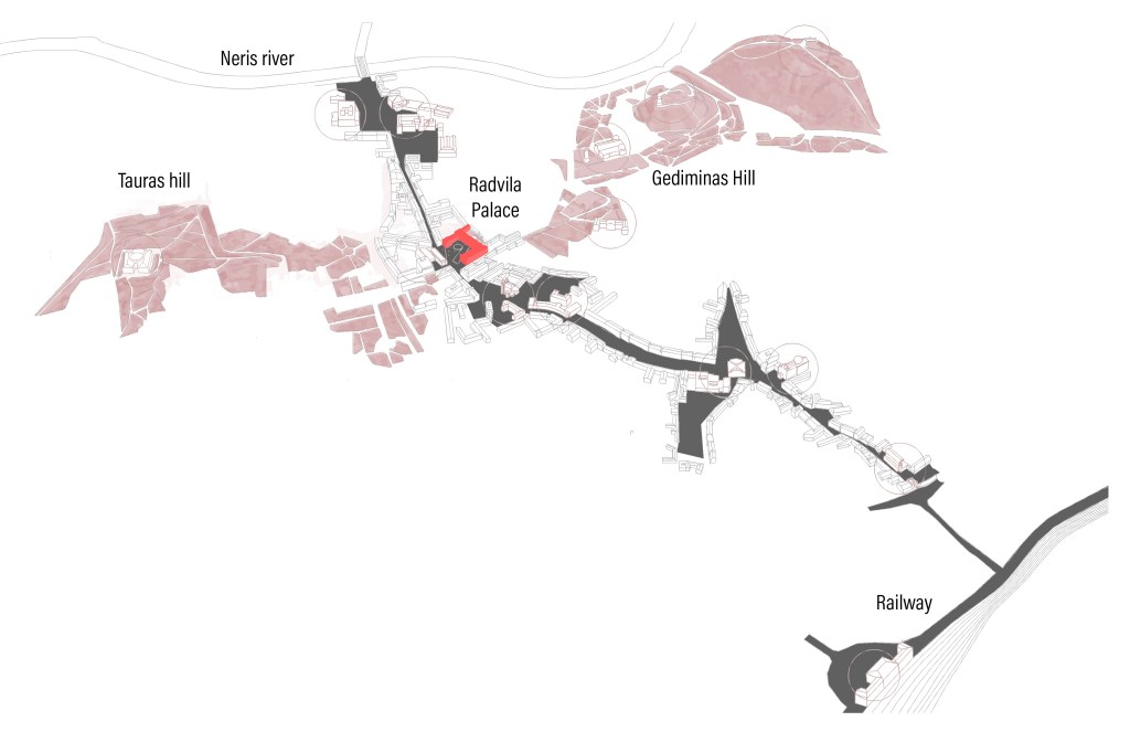On the other hand, the site is crossed by the landscape system that connects Gediminas Hill with Tauras Hill, symbolic strongholds of the city, in a succession of green spaces which are more or less accessible but which in fact constitute an important ecological corridor and lung for the historic center.