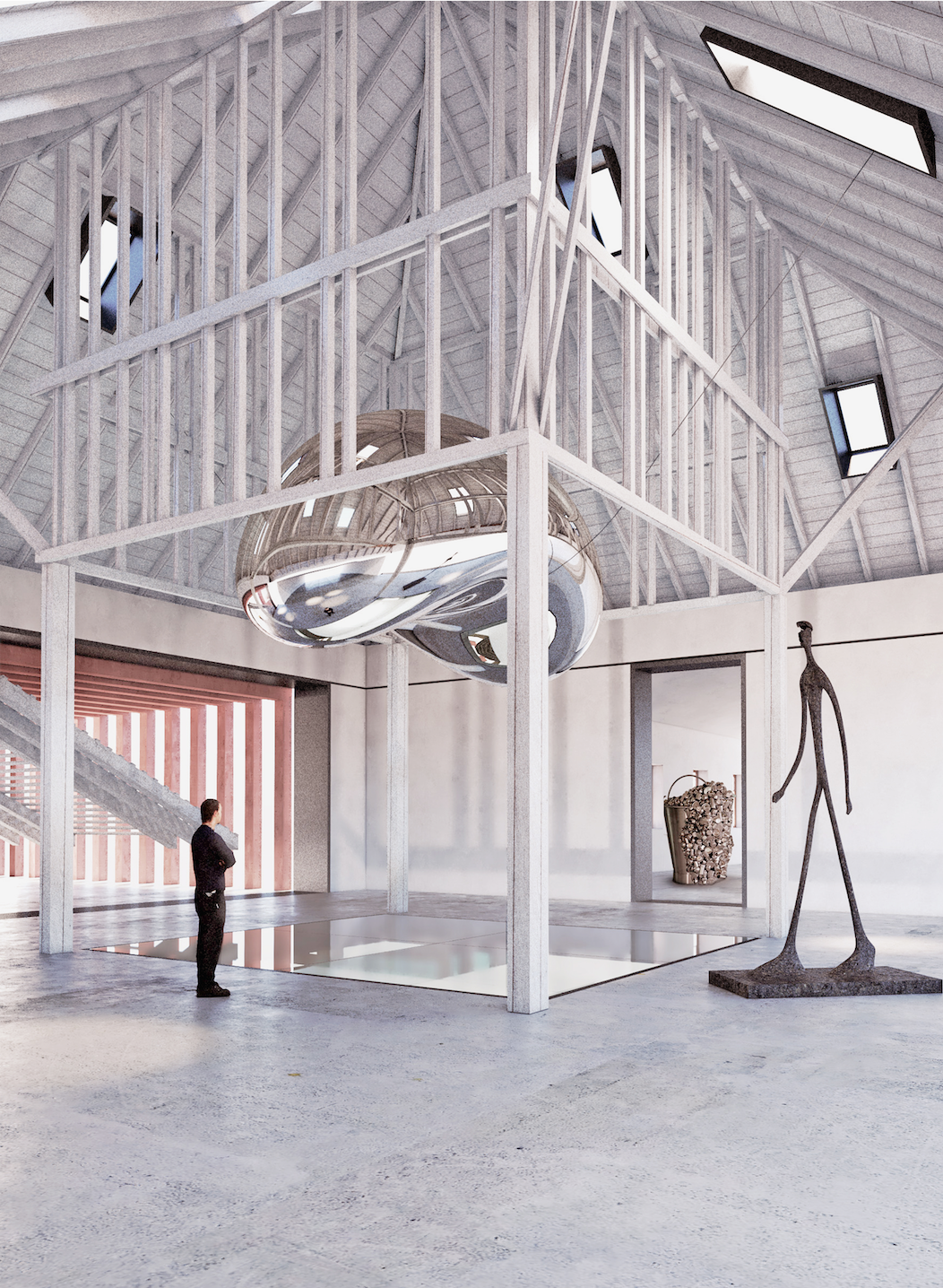 The outdoor space is made of two large squares. The front square has the characteristics of a social civic space that welcomes visitors and directs them towards the entrance of the new museum. A further layer overlaps the design of the flooring: an oblique sign that guides the visitor towards the entrance of the museum and towards the square behind it, breaking the horizontality of the main lines and generating a zenithal suprematist composition together with the circular lake. The other square is a wooded area: an element that mends the urban voids behind the museum; generating a visual continuity with the hilly landscape that the visitor admires from the top floor of the museum.
