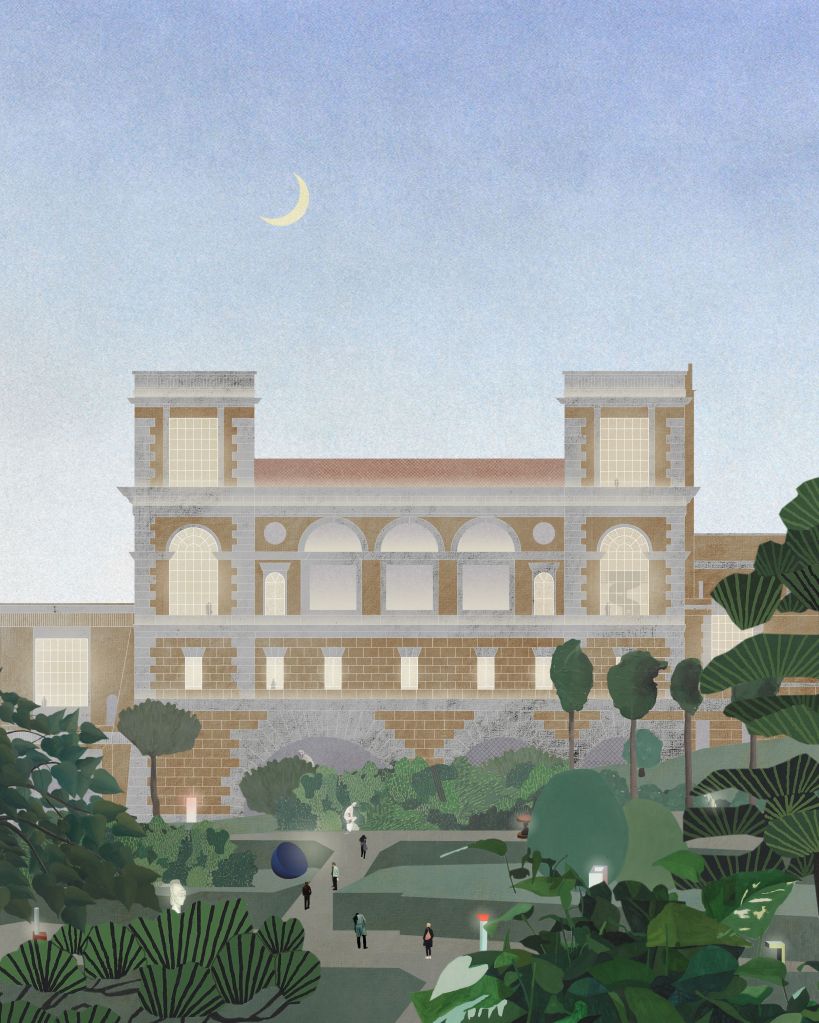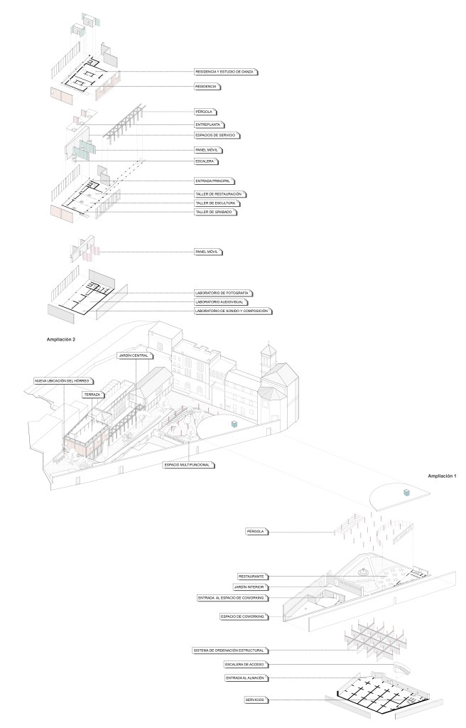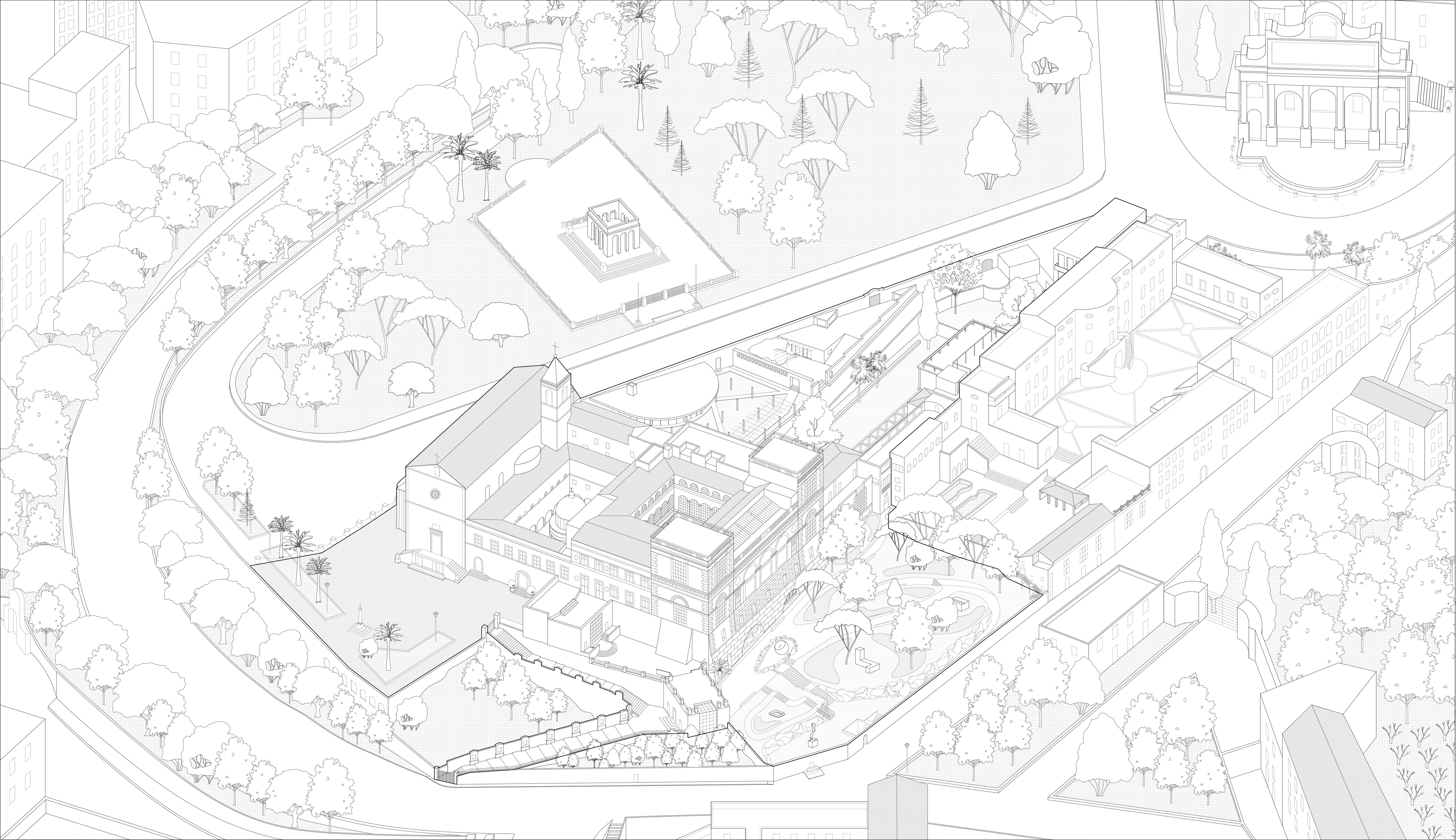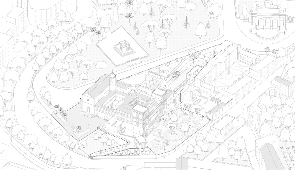 I nuovi ampliamenti si presentano come la prosecuzione dell’esistente, ancora oggi disorganico e frammentato. L’obiettivo è quello di sintetizzare attraverso il tema del recinto e il disegno del suo tracciato i diversi fabbricati esistenti in un unico sistema organico che rispetti le quote esistenti gerarchizzando i differenti ambiti spaziali. Il giardino rimane il grande vuoto terrazzato intorno al quale si ristrutturano gli ambienti esistenti sul lato sud e si prosegue coerentemente l’ultima estensione del ‘900 a nord rispettando le emergenze architettoniche che abitano i due muri perimetrali. Sul muro nord, l’ala del ‘900 è la base tipologica per una prosecuzione del fabbricato attraverso un linguaggio architettonico che, ridotto ai minimi termini estetici, non entri in conflitto formale e dialoghi in maniera sintetica con l’esistente. Sul muro sud, si propone il recupero degli spazi di servizio che occupano in maniera non organica la terrazza con gli accessi su via Garibaldi, aggiungendo un nuovo episodio architettonico per la ristorazione pubblica; la sua indipendenza formale si distacca dalle preesistenze poiché accoglie funzioni differenti. Questi due ampliamenti sono partecipi di una strategia comune di riconfigurazione del giardino e valorizzazione degli spazi aperti attraverso la rimodulazione dei suoi bordi e percorsi.
