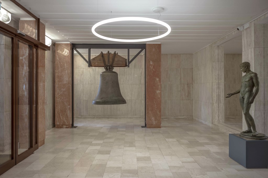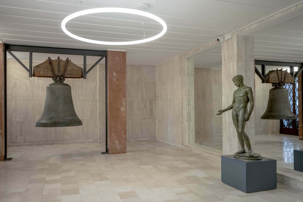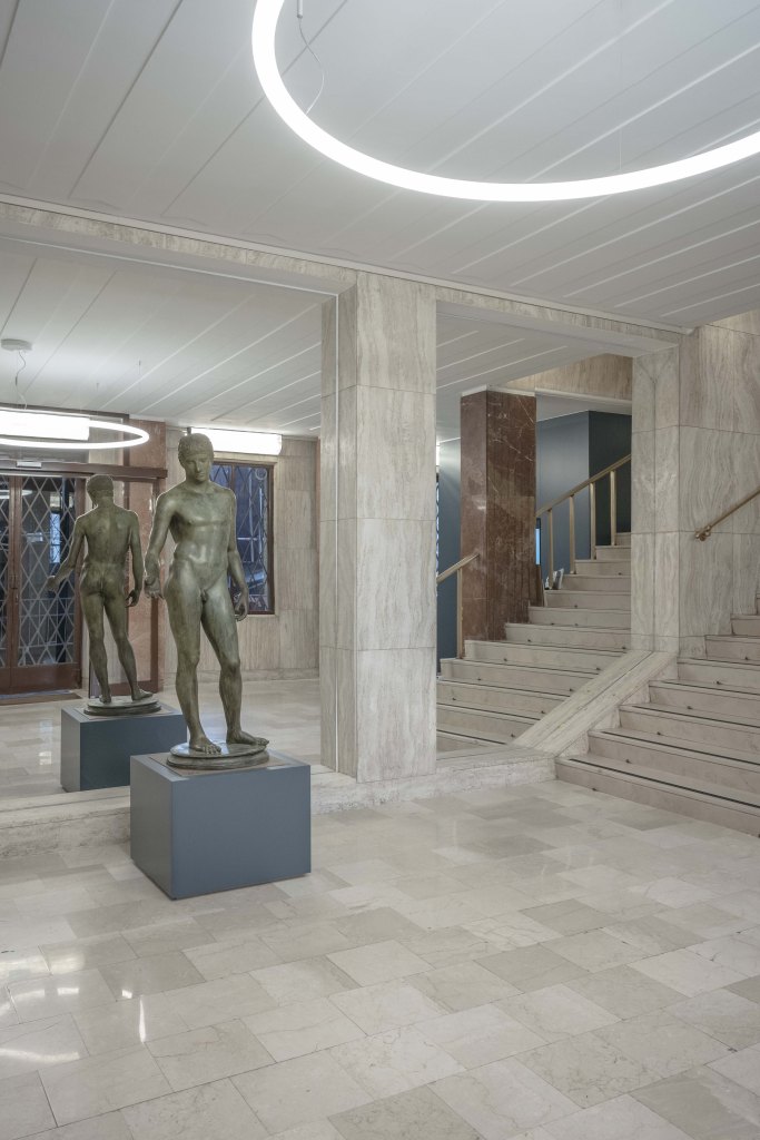 L’Idolino di Pesaro, copia romana di un originale greco, è stato posizionato al centro dell’atrio, davanti a tre nuove superfici riflettenti. Gli specchi donano profondità all’ingresso, ridefinendo le originarie proporzioni dello spazio, prima che il Teatro Sperimentale occupasse il cortile interno alterando l’originario ritmo tra pieni e vuoti.
