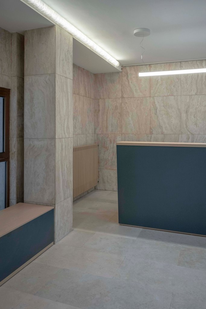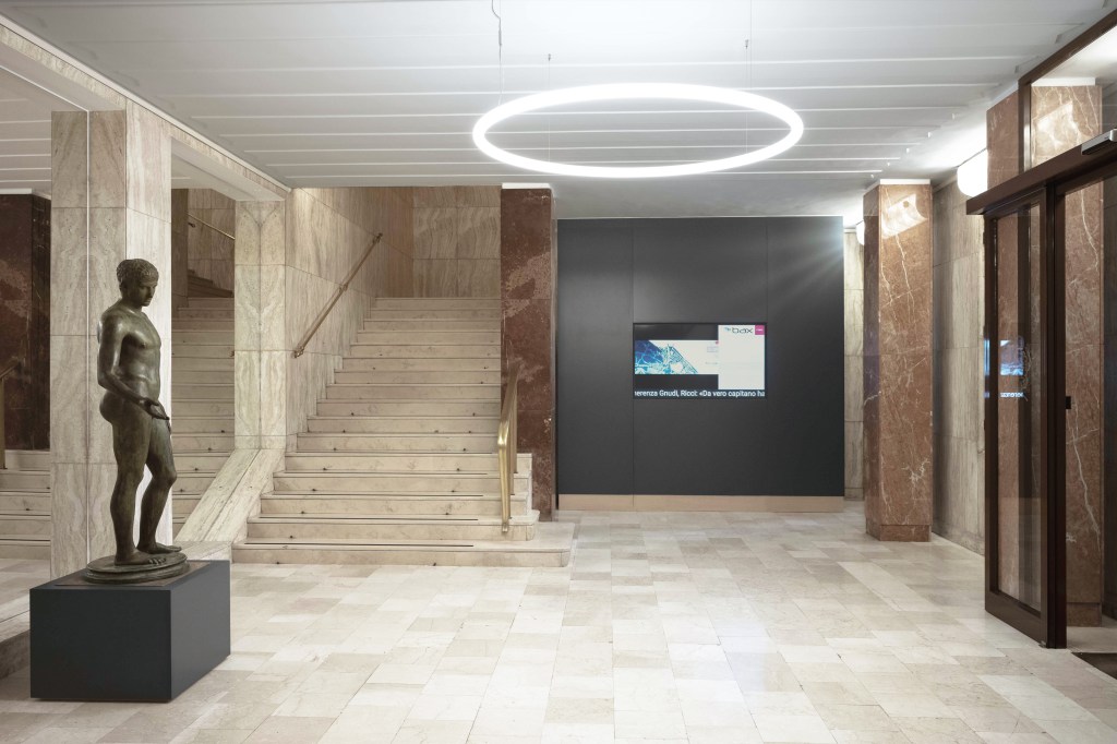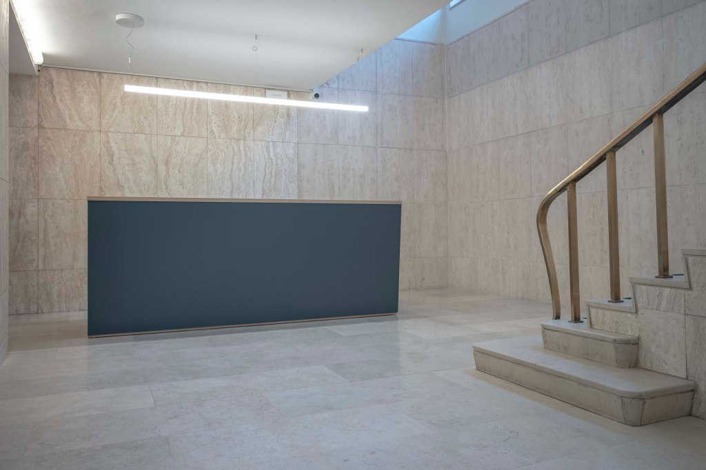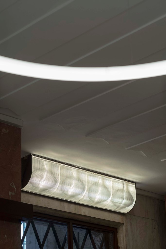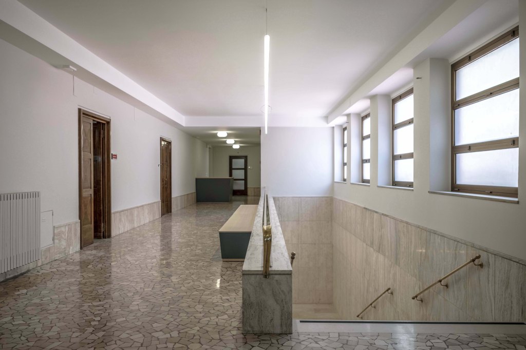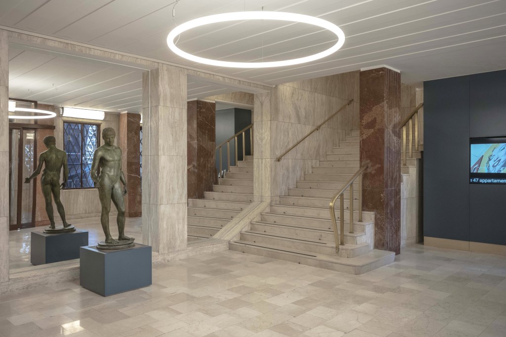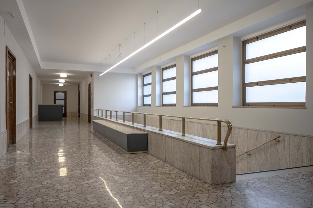 Ad un’azione di restauro dei marmi e dei componenti in ottone, è seguito il relamping dei corpi illuminanti in vetro curvato, integrati con nuovi elementi a tutta luce, oltre al disegno del nuovo mobilio.