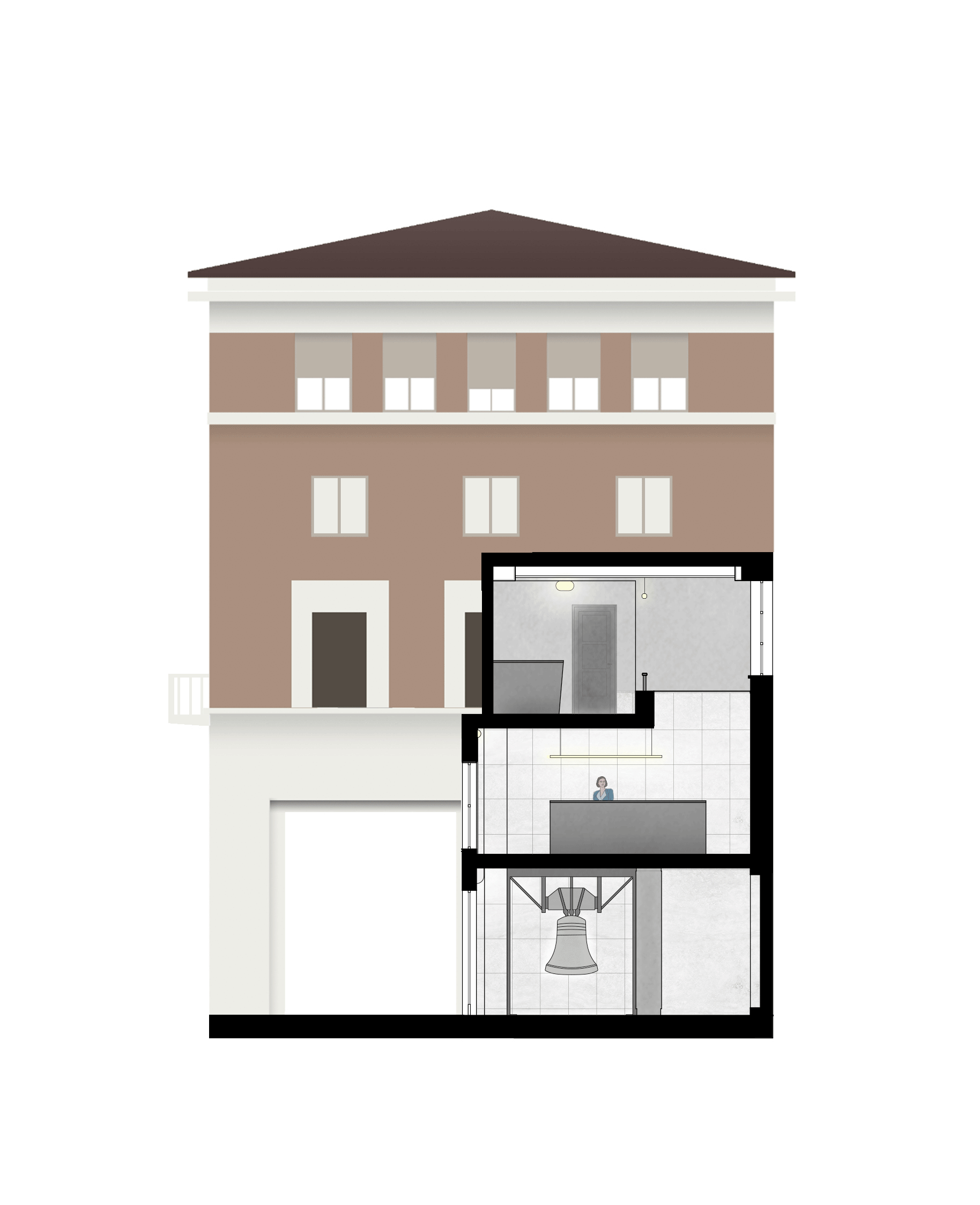 Seguendo lo sviluppo dello scalone centrale, l’intervento opera su tre livelli: il piano terra, che affaccia su Piazza del Popolo, il piano mezzanino, riconfigurato con funzione di ricevimento, il piano istituzionale, che ospita la sala consiliare e gli uffici del sindaco.