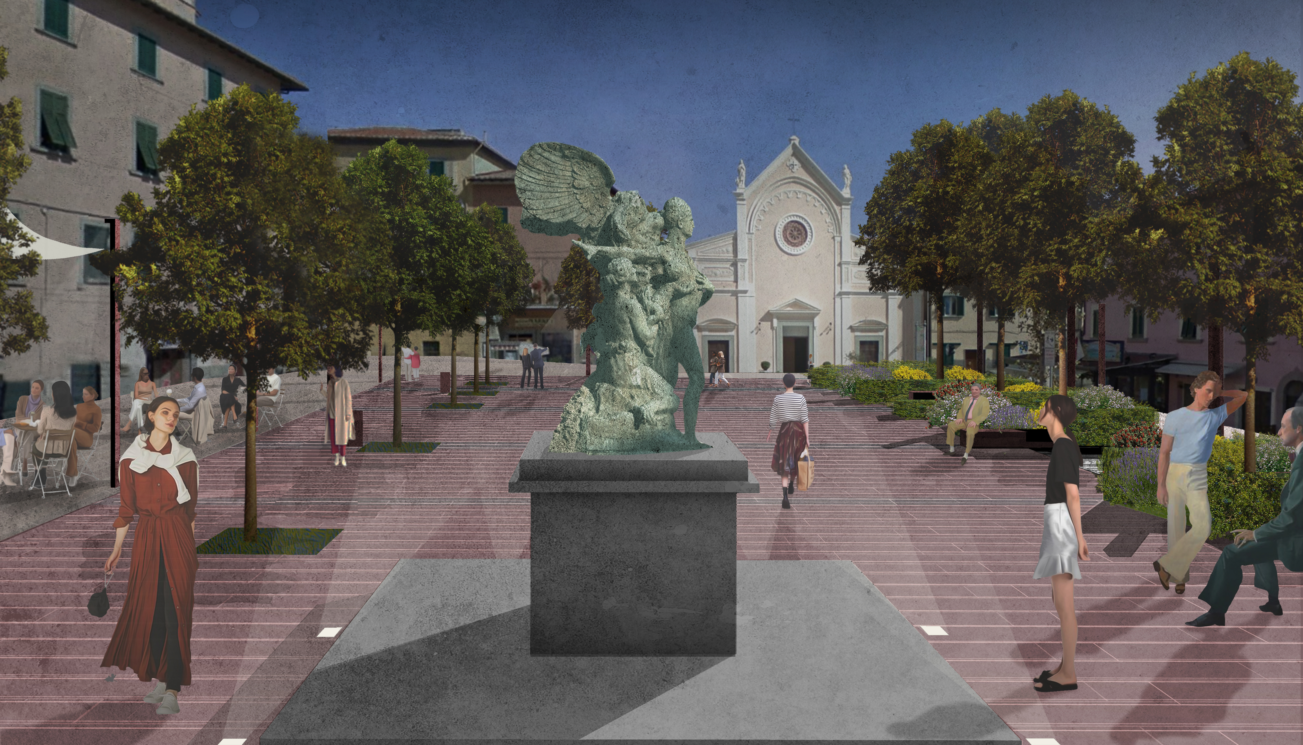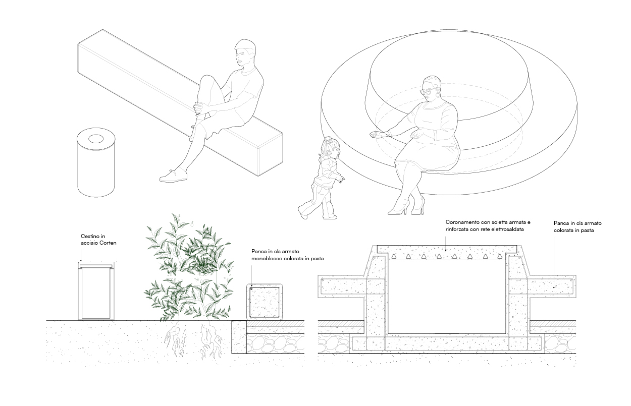 Il muro con balaustra che attualmente delimita su due lati la piazza viene eliminato; inoltre, i gradoni che cingono il lato sud ed il segmento prospiciente la chiesa presentano una duplice funzione. La prima è quella di avere una visuale aperta su tutto lo spazio senza barriere visive. La seconda è quella di offrire un nuovo luogo di sosta per implementare l’aggregazione sia sul fronte commerciale sud-est che di fronte al sagrato del Duomo, dove un’altra seduta sostituisce il dislivello con balaustra.