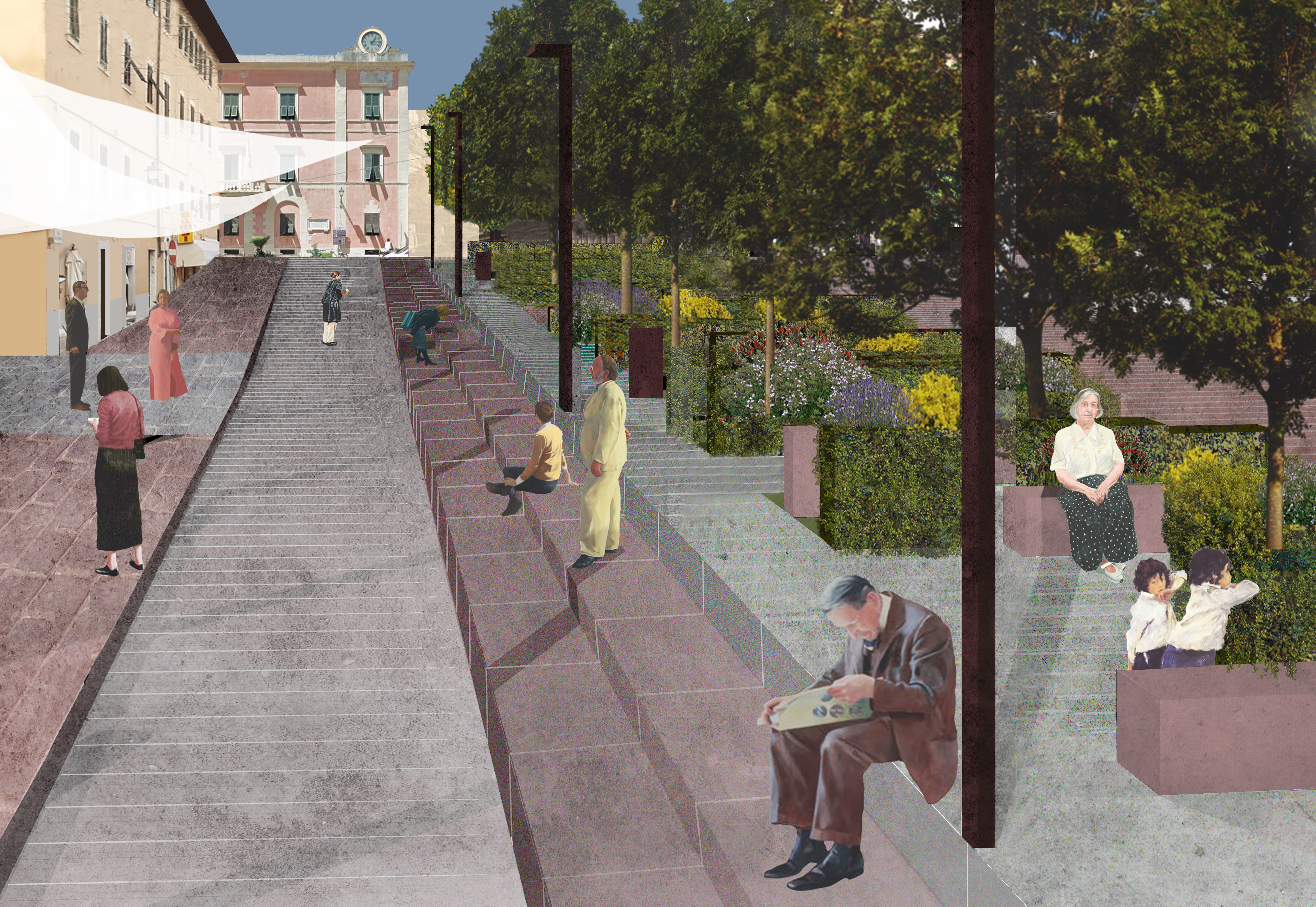 Sono il colore – il rosa antico, ancora presente – dei pavimenti e della pietra e l’odore – ora scomparso – dei piccoli giardini del ‘900, ad essere i due primitivi spunti progettuali intorno ai quali si sviluppa la proposta architettonica per Piazza della Repubblica a Portoferraio.
