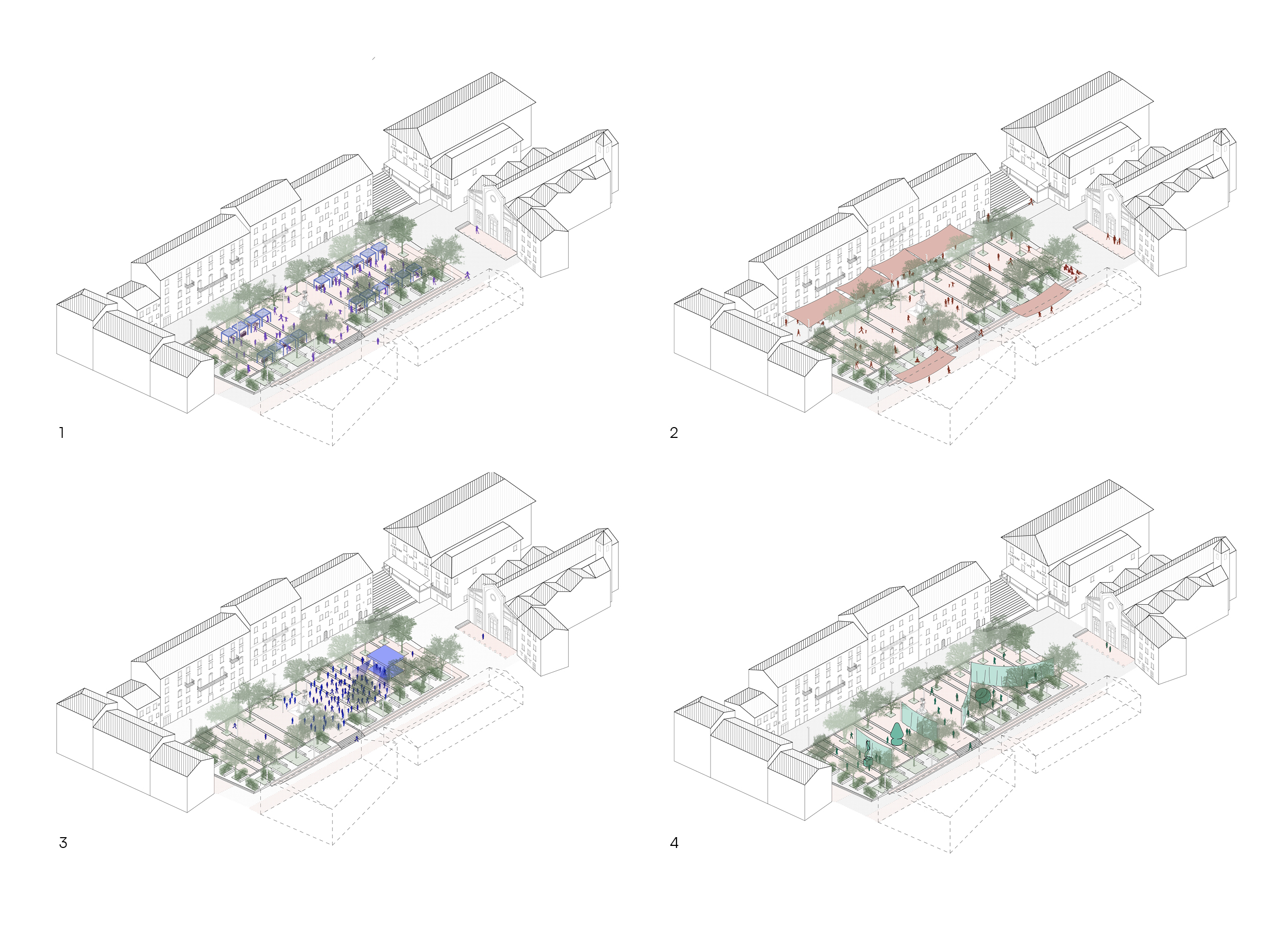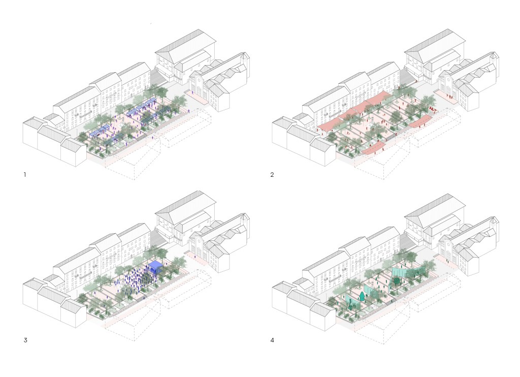 Il perimetro verde esistente è oggi una seconda barriera che non permette nessuna relazione tra architettura e spazio pubblico. Il progetto prevede l’eliminazione delle siepi presenti proponendo una nuova pavimentazione che regolarizza la forma dello spazio centrale una successione di “stanze verdi”: nuove siepi e panche sono disposte perpendicolarmente al perimetro offrendo una sequenza di spazi più intimi e ombreggiati. La nuova area verde reinterpreta la memoria dei “giardinetti” costruiti nel 1900 e scomparsi negli anni 30.