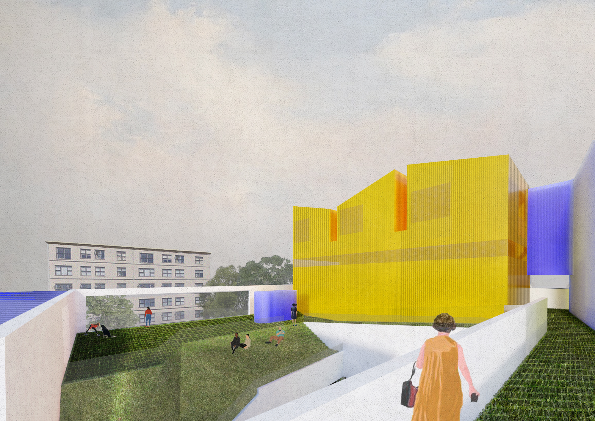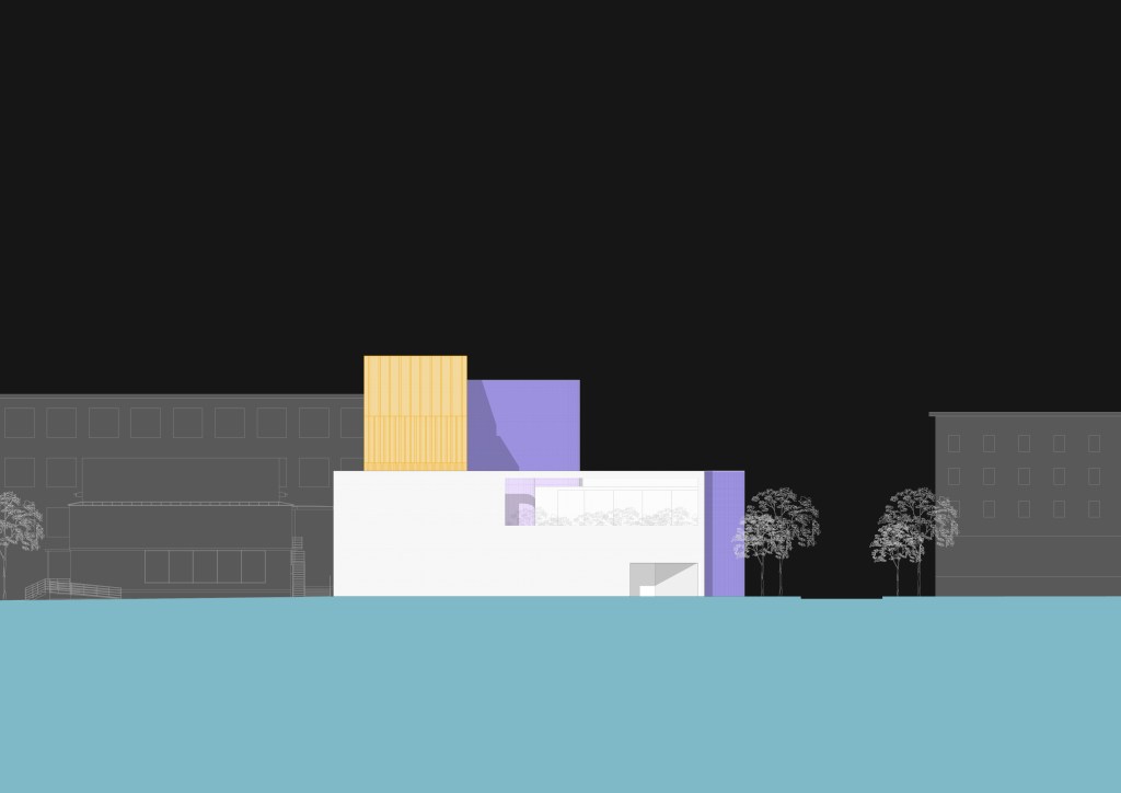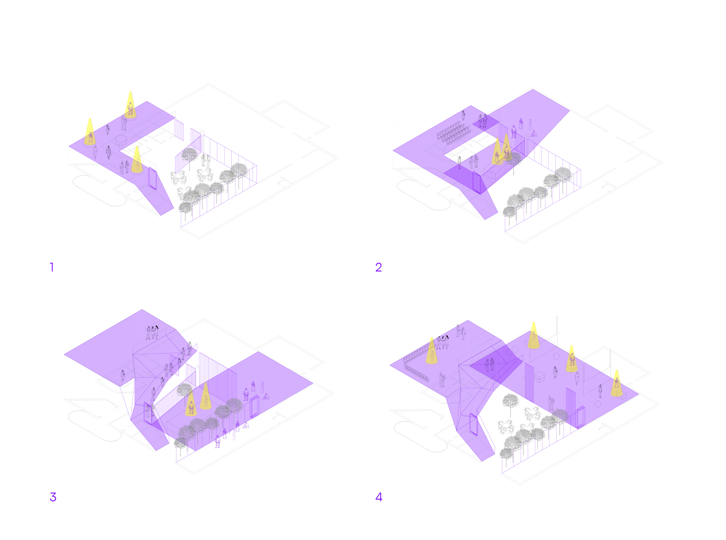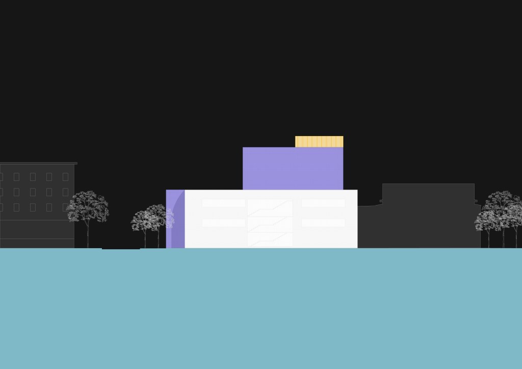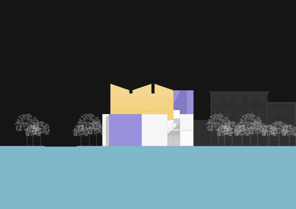 The scenic tower functions as a scenography that draws attention to the site as a totem in sky. It hosts, starting from the bottom, the main hall, the rehearsal space and the artists’ residences, in an anticlimactic metaphor of the artistic experience: from their accommodation at the top, the artist descends to the public as the play unfolds from the rehearsal space to the stage. The purple elements invade the space connecting levels with the stairs, resembling a puppet laying on the stage after a performance. In the main theatrical space, consisting of foyer, main hall and summer stage, a system of soundproof curtains sets the scene whereby the curtain is never lowered, like a performance that never ends.
