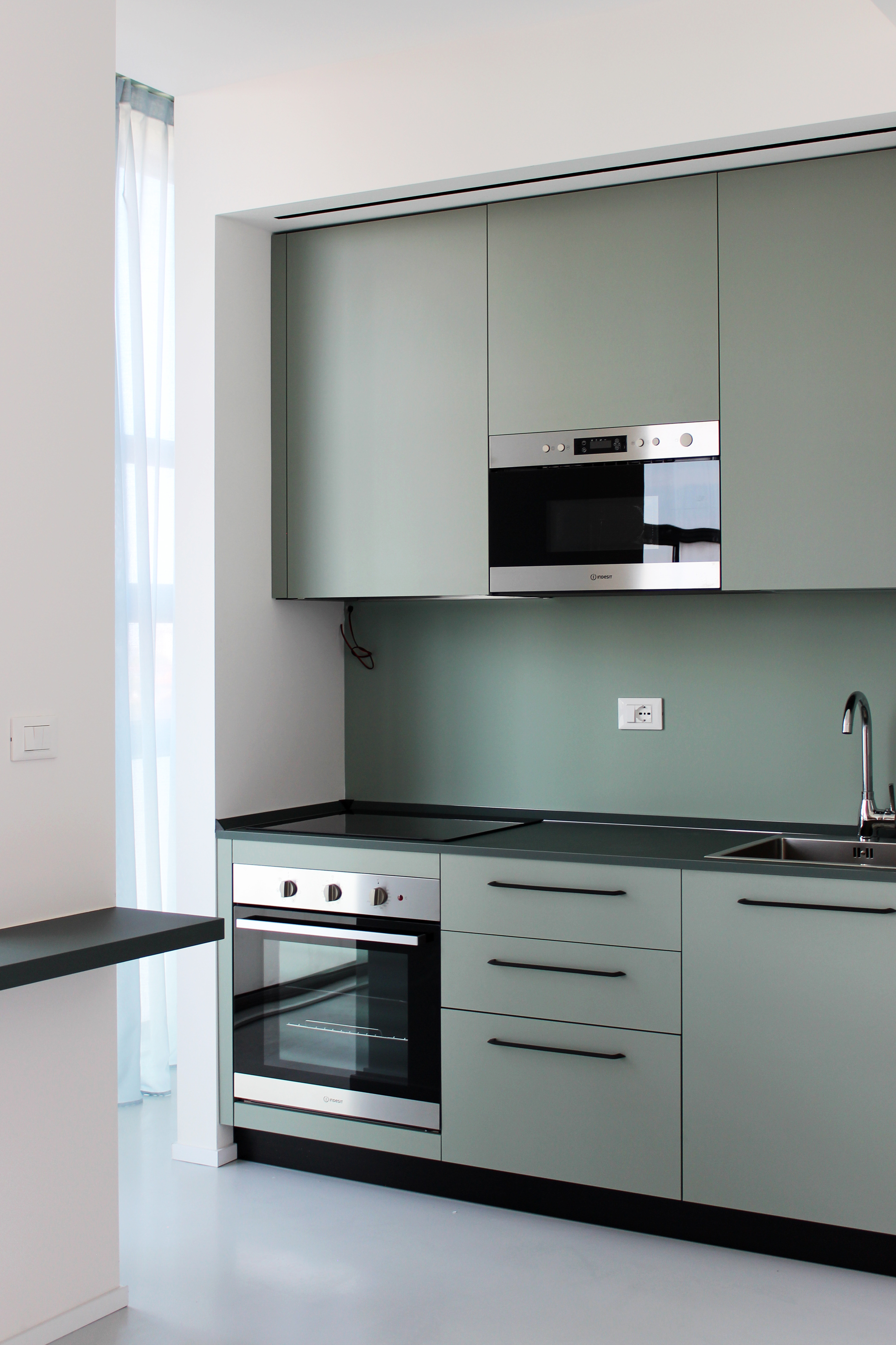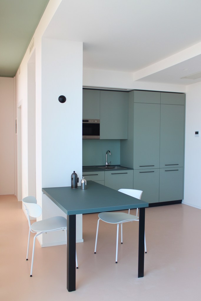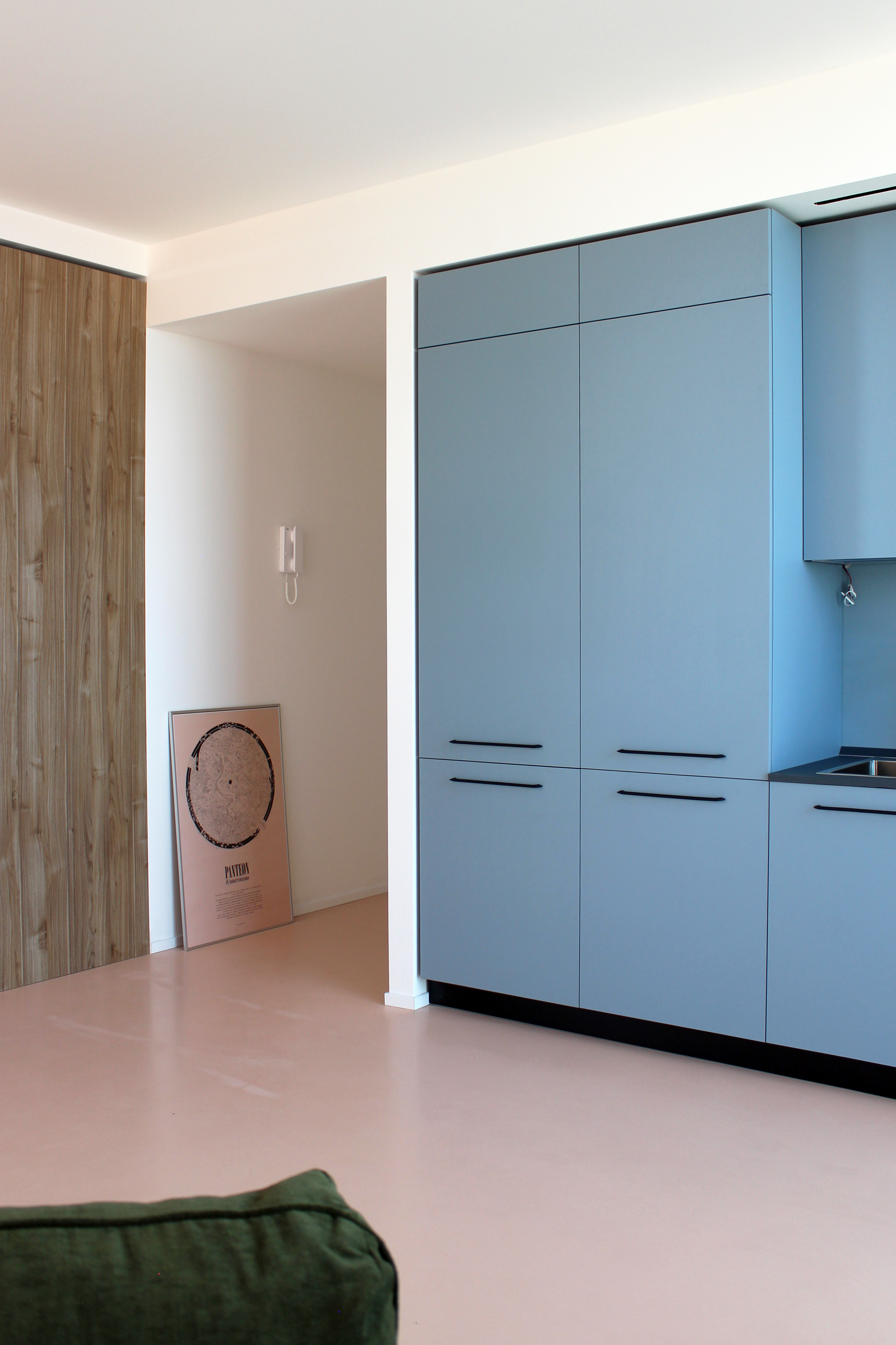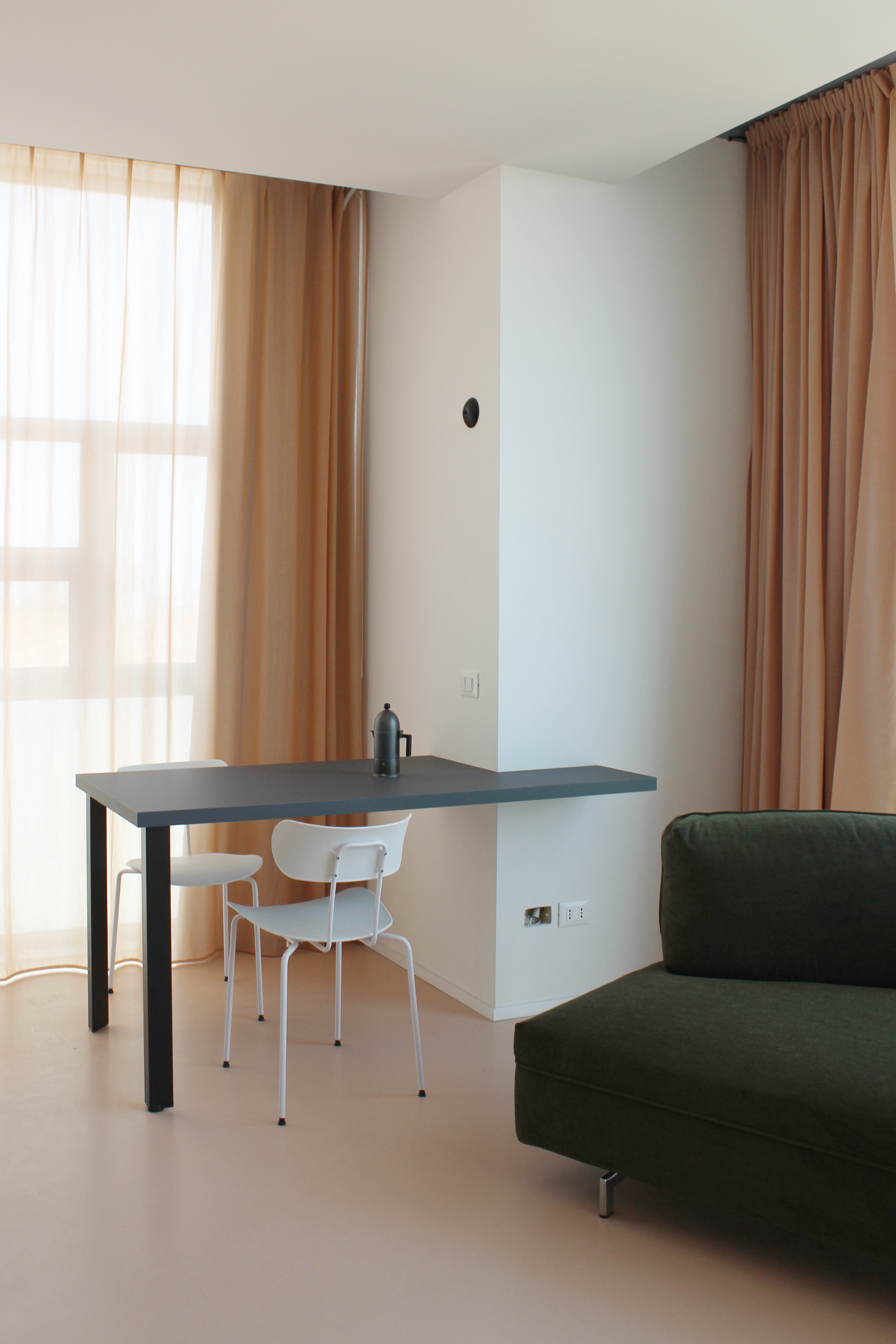 Il progetto definisce le unità abitative — 3 per ogni livello — sulla base di metrature differenti ma accomunate dai principi di modularità e reversibilità che rappresentano il concept distributivo dell’intervento. Nell’ottica dell’ottimizzazione degli spazi il progetto ha prediletto la scelta di arredi su misura e soluzioni integrate che contribuiscono alla caratterizzazione degli ambienti e al contempo favoriscono una percezione spaziale amplificata, coadiuvata anche dalla selezione dei materiali e dallo studio sul controllo dell’illuminazione naturale. La distribuzione in pianta è la medesima per entrambi i livelli, la differenziazione delle unità abitative tra il sesto e il settimo piano è affidata all’assegnazione di cromie differenti agli elementi caratterizzanti i micro-appartamenti: le pavimentazioni e i sistemi di oscuramento interno. Il piano sesto si distingue per una pavimentazione in resina grigio-azzurra, abbinata a tendaggi sulle stesse tonalità; al piano settimo le colorazioni del pavimento e dei tendaggi virano verso i toni del rosa antico. Al colore del mobilio è affidata invece la distinzione tra i differenti “tagli” dei vari appartamenti sui due livelli.