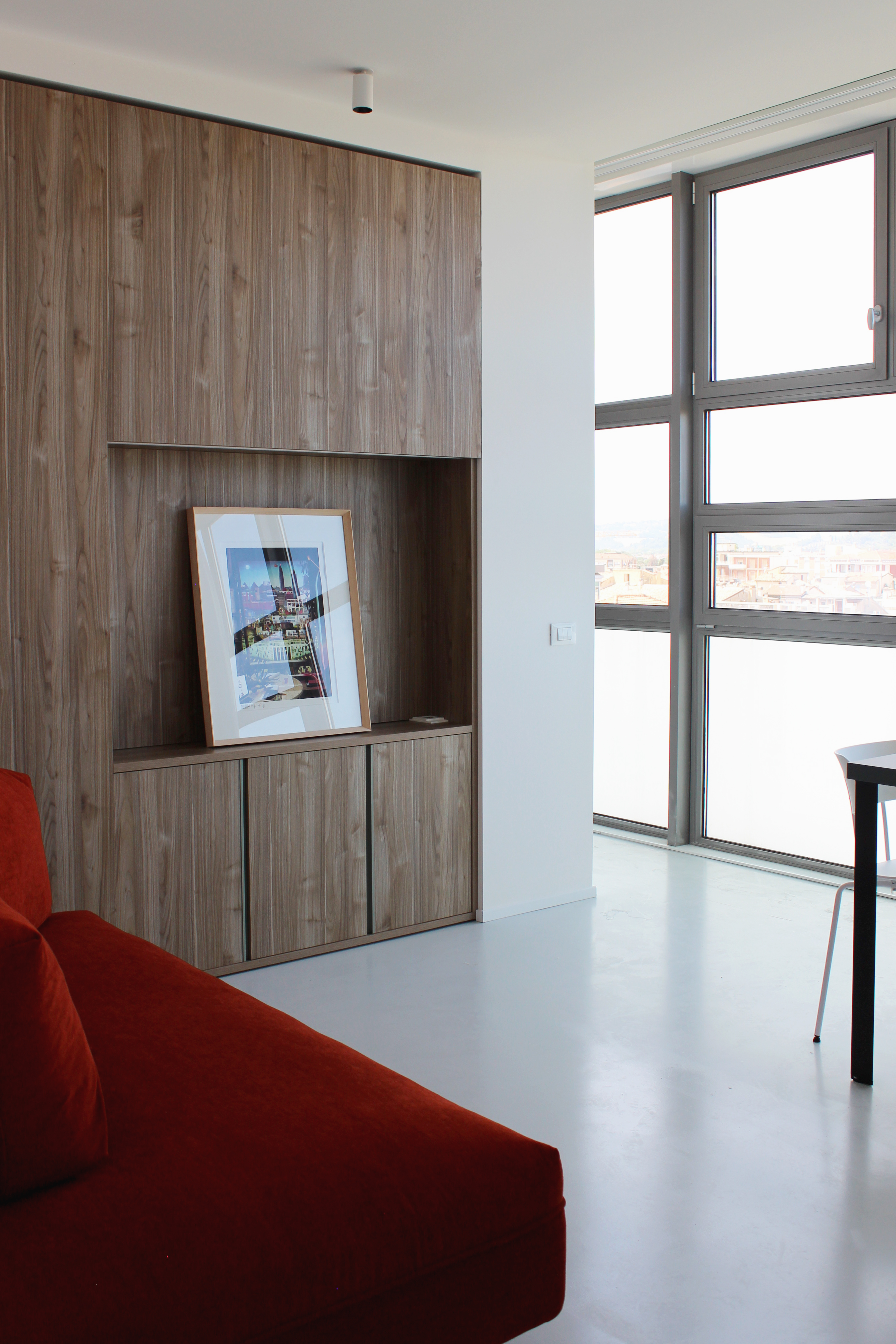 A Pesaro, a pochi passi dal centro storico, si erge il “Palazzo di Vetro” iconico esempio del linguaggio architettonico modernista del secondo novecento inserito all’interno del tessuto urbano consolidato. La sua facciata di nove piani completamente vetrata è stata sostituita nei primi anni del 2000 da intervento di ristrutturazione che ne ha leggermente alterato la partitura. In questa cornice si colloca l’intervento che ha previsto la riconversione di due piani precedentemente destinati a uffici, in sei micro-appartamenti. I due livelli, il sesto e il settimo, si presentavano al grezzo, caratterizzati esclusivamente da due fattori che hanno rappresentato il fulcro della sfida progettuale: da un lato la rigida maglia di pilastri e colonne impiantistiche, dall’altro i due prospetti su strada completamente vetrati.