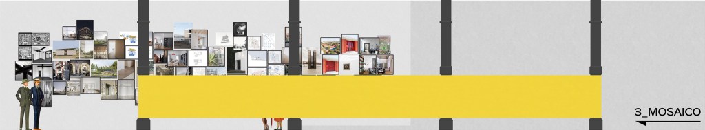 Il terzo ambito, mosaico, compone un affresco ottimista, una quadreria di undici studi di architettura romani emergenti, under 40, distintisi per la capacità di coniugare e comunicare ricerca e progetto, su scala locale, nazionale ed internazionale: Sofia Albrigo, AUT AUT, Azzariti-Cappella, Brunelli-Ann Minciacchi, EXPAND, GICO, Grazzini-Tonazzini-Colombo, LATITUDE, SET, SUPERVOID, WAR. Oltre ad una sintetica antologia di opere progettate e realizzate dagli stessi, viene esibito, come da tradizione disciplinare, un esercizio teorico – formale site specific, un ponte sul Tevere: “un fatto di forma pura, un oggetto in piena luce” (Riccardo Morandi).