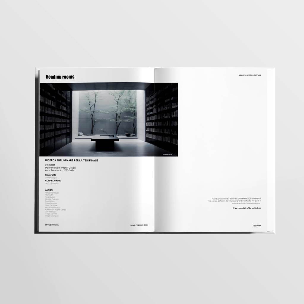 The thesis project “Reading Rooms,” in collaboration with Biblioteche Roma Capitale, aims to renovate the interior design of three libraries located in Rome, selected in collaboration with IED. The magazine represents the outcome of the initial phase of the project, focused on research. This phase is divided into five individual exercises, in which each student had the opportunity to carry out the work by producing graphic projects. The goal was to stimulate in-depth reflection on various topics, represented by each proposed exercise, all aiming for the same outcome: to gain a broader and more mature understanding of the topic at hand and to achieve greater mastery of communication tools.