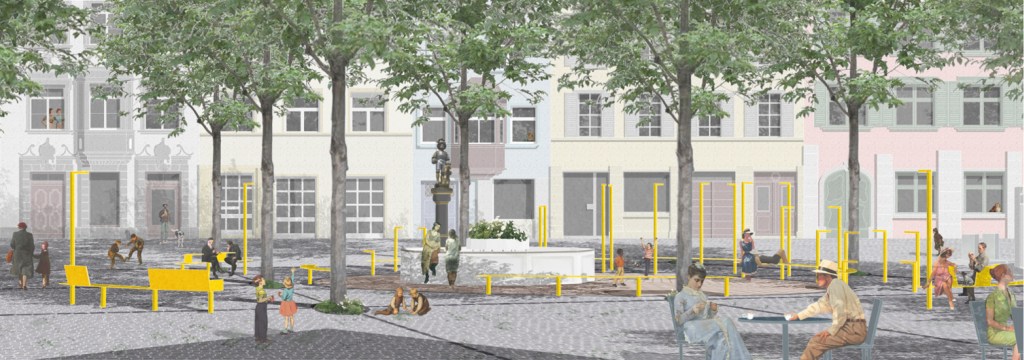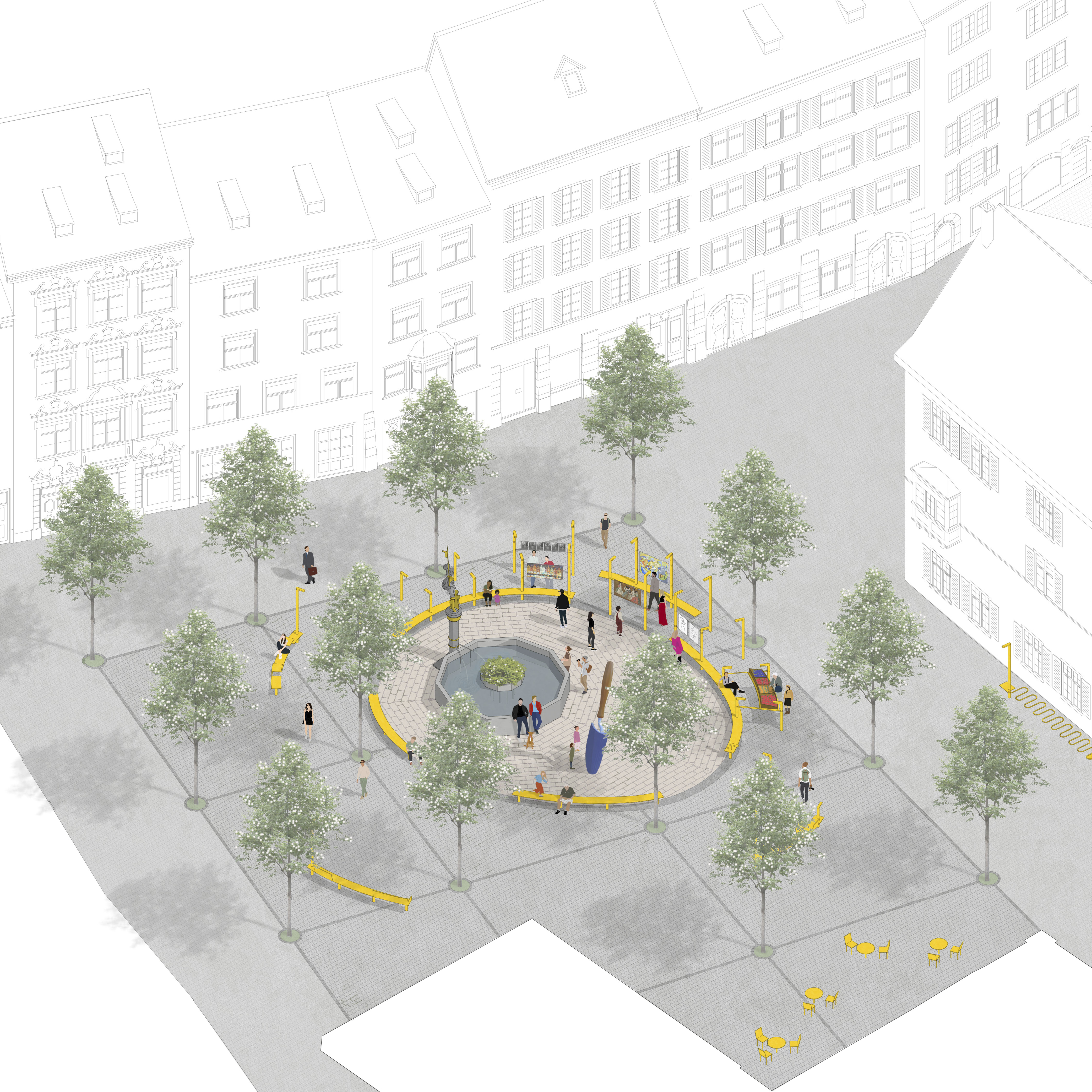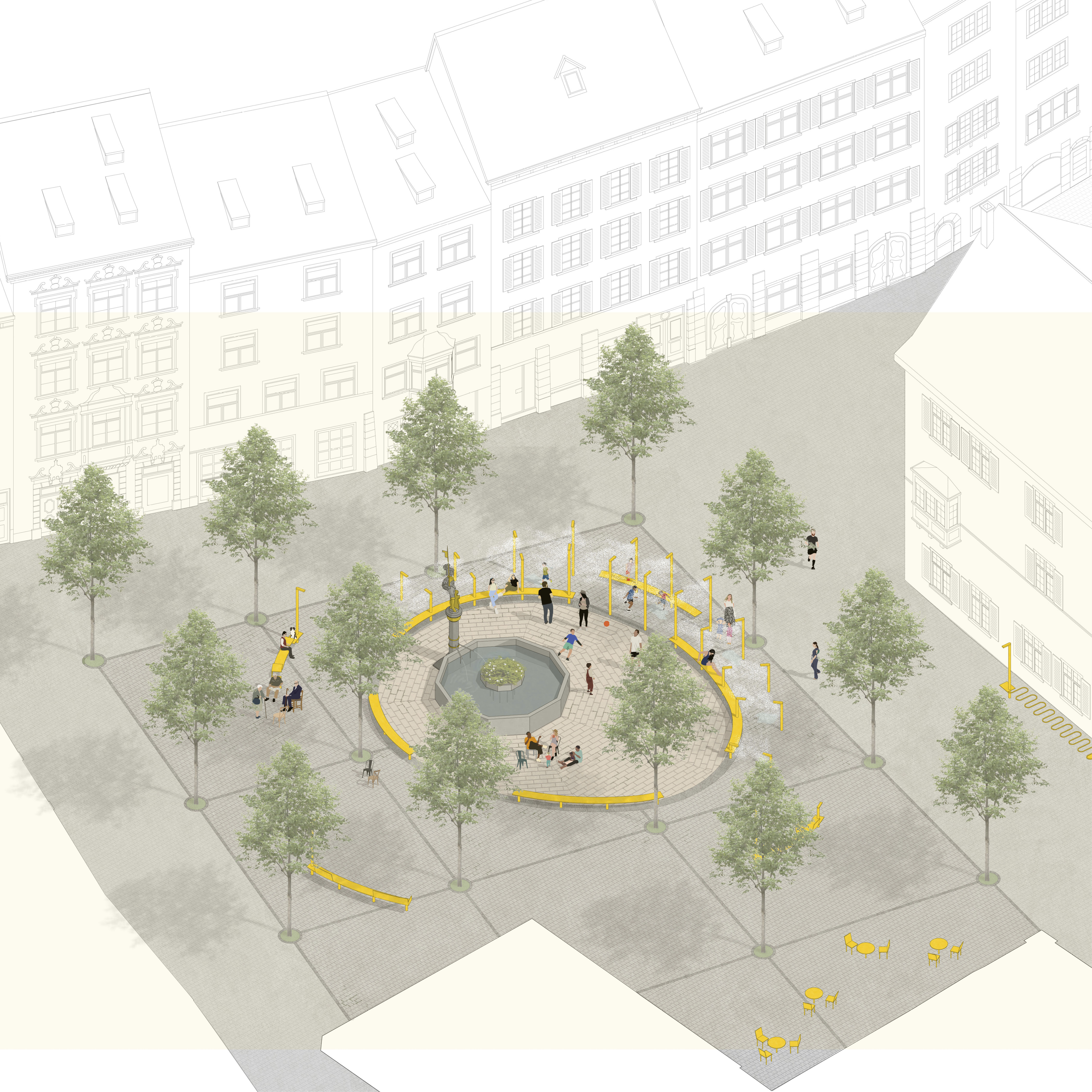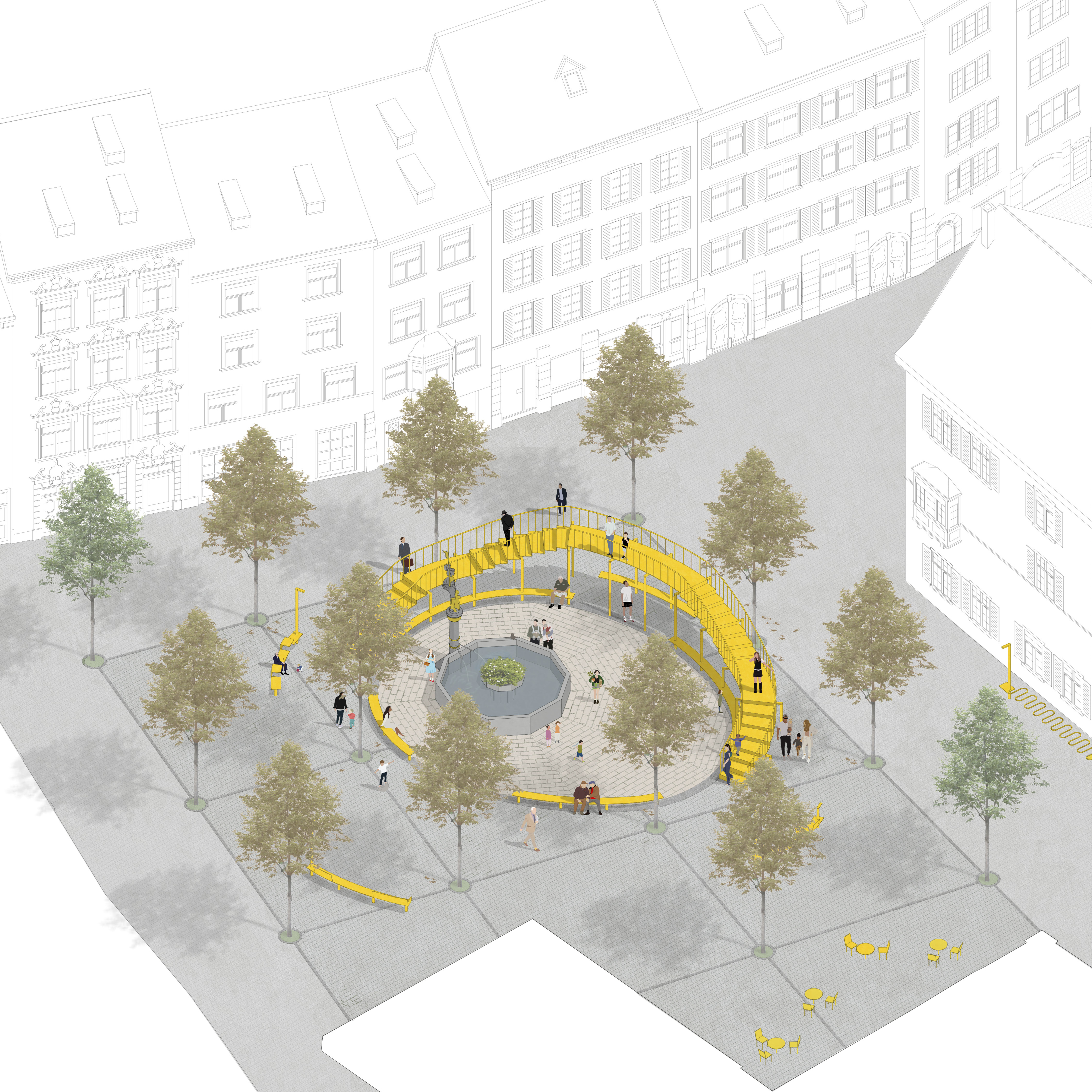 La pavimentazione della piazza è immaginata simile a quella già esistente nella piazza e nell’area circostante per connettere la piazza al resto del centro storico: è composta da blocchi di granito grigio, più chiari al di fuori della griglia e più scuri all’interno, con spazi tra i blocchi per permettere al terreno di “respirare”, di assorbire l’acqua e far crescere la piccola vegetazione. Anche il perimetro dell’ellisse e la griglia tracciata sono realizzati in granito grigio scuro, sebbene differenti nelle dimensioni e nell’aspetto rispetto al resto. Il secondo strato – quello contemporaneo – deriva da quello storico: la forma ellissoidale della pavimentazione che circonda la fontana si alza in terza dimensione, diventando una panchina di colore giallo brillante – lo stesso presente nello stemma di Schaffhausen, per affermare e collegarsi all’identità della città.
