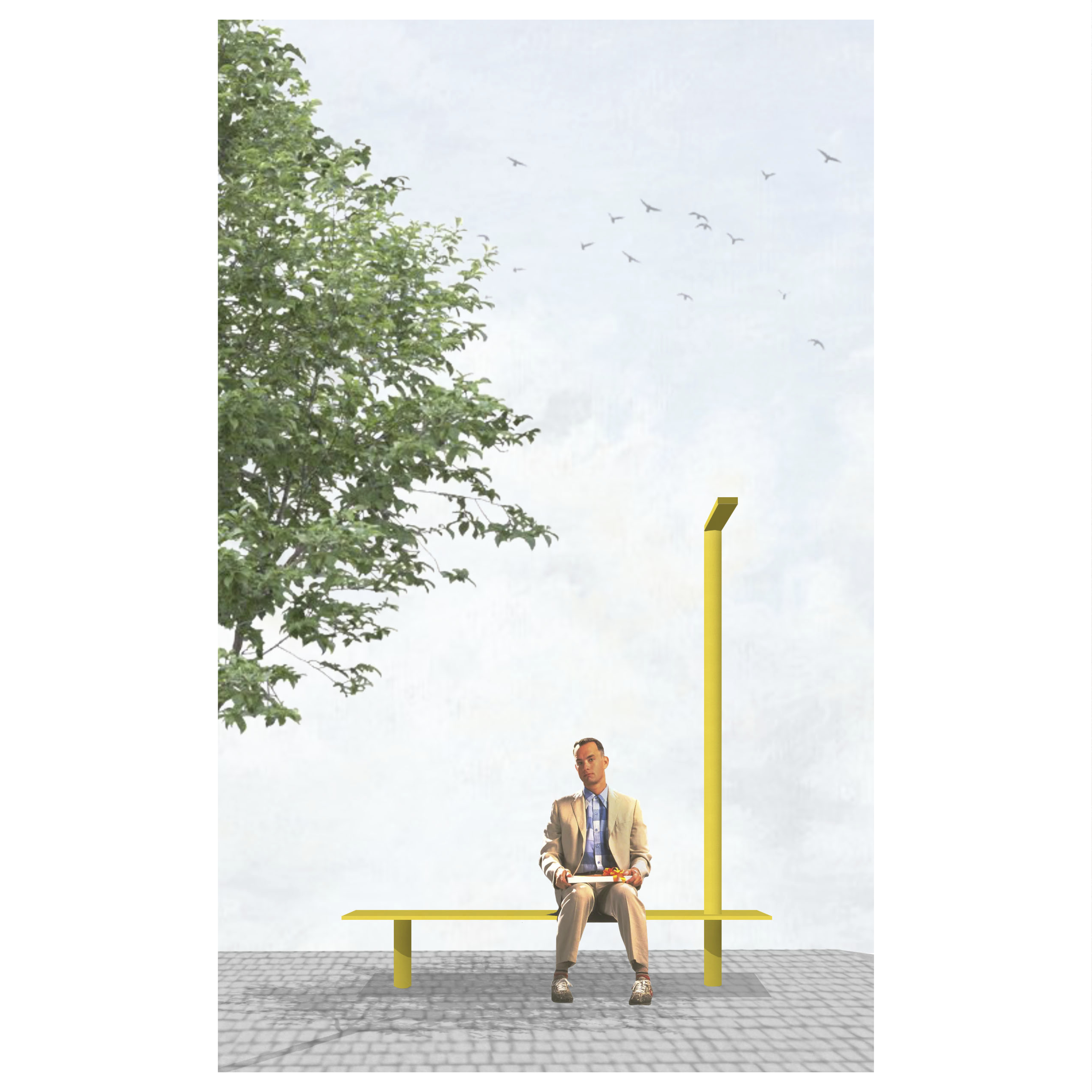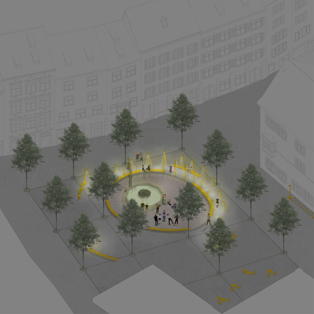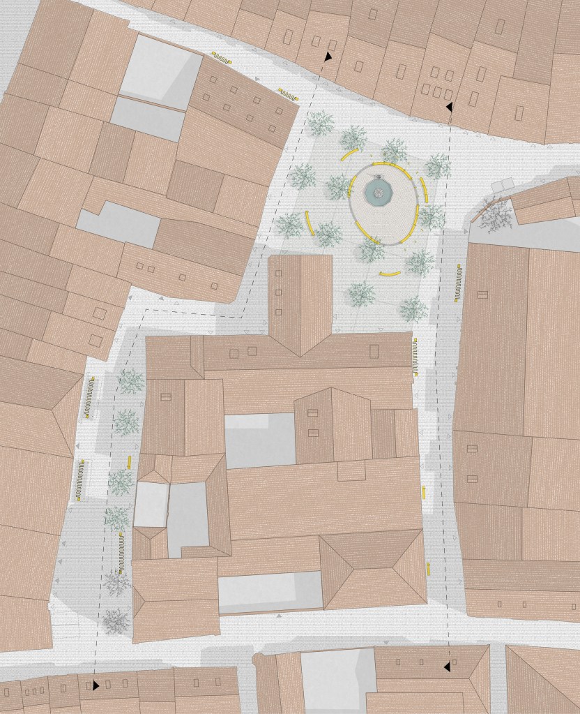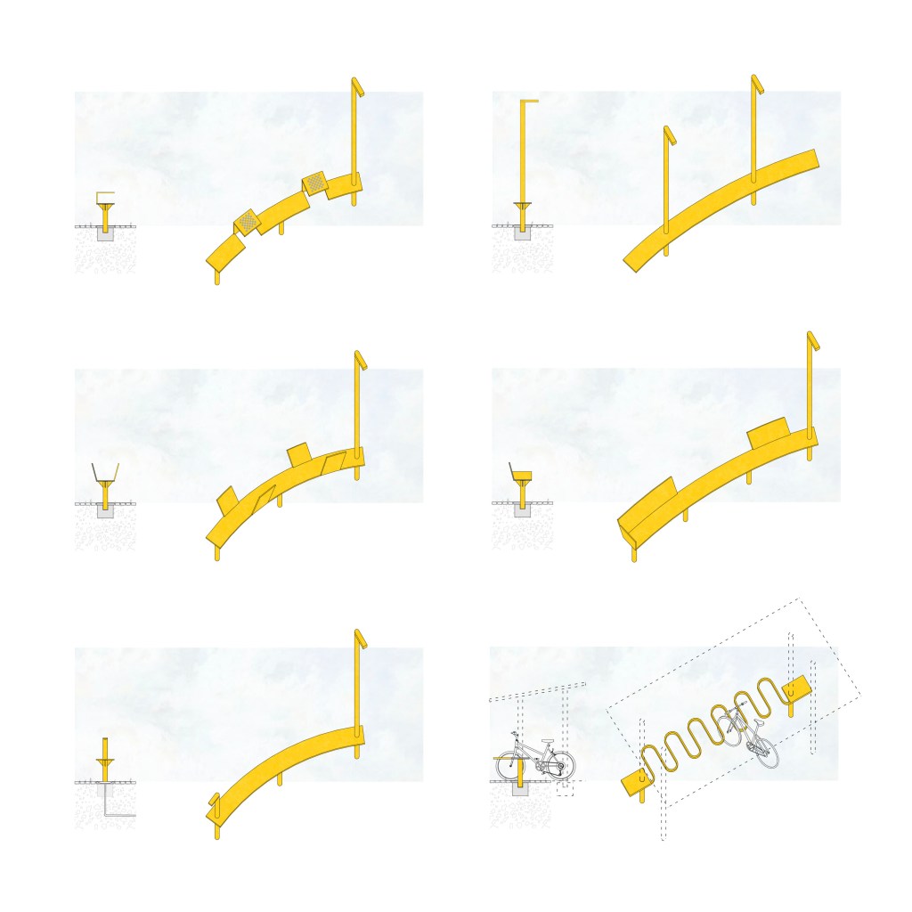 Per permettere l’ingresso nell’ellisse, la panchina “esplode”: alcune sue parti rimangono sul perimetro, mentre altre si spostano verso l’esterno, contribuendo alla dinamicità dello spazio. Le panchine sul perimetro rimangono semplici, mentre quelle spostate presentano diverse modifiche: una con scacchiere dove i visitatori possono venire a giocare, una con schienali rivolti in direzioni opposte, così che gli utenti possano guardarsi (la cosiddetta “panchina degli innamorati”), e una con schienali più grandi, simili a divani, per accogliere più persone (la cosiddetta “panchina degli amici”). Le panchine sono sostenute da pali in acciaio dello stesso materiale e colore. Variano in altezza e sono pensati come strutture multifunzionali che, oltre alla funzione portante, forniscono l’illuminazione e integrano un sistema che, durante le calde giornate estive, crea una leggera nebbiolina d’acqua per rinfrescare lo spazio. La loro disposizione e altezza differente creano una sottostruttura che può sostenere diversi utilizzi dello spazio in differenti scenari ipotetici. Tutte le panchine e i pali sono pensati in acciaio, rendendoli facilmente (re)movibili, permettendo allo spazio di aprirsi ulteriormente, se necessario. Le strade adiacenti a sud sono dotate delle infrastrutture necessarie per parcheggi bici e auto, con panchine illuminate, realizzate nello stesso materiale e colore di quelle della piazza, collegando lo spazio e consentendo una graduale transizione visiva verso il resto della città. La piazza diventa il salotto del centro storico, uno spazio per rilassarsi e godersi un libro o un pasto, ma anche uno spazio che può ospitare incontri ed eventi che rafforzano lo spirito di comunità, portando vita e movimento nel quadro storico.