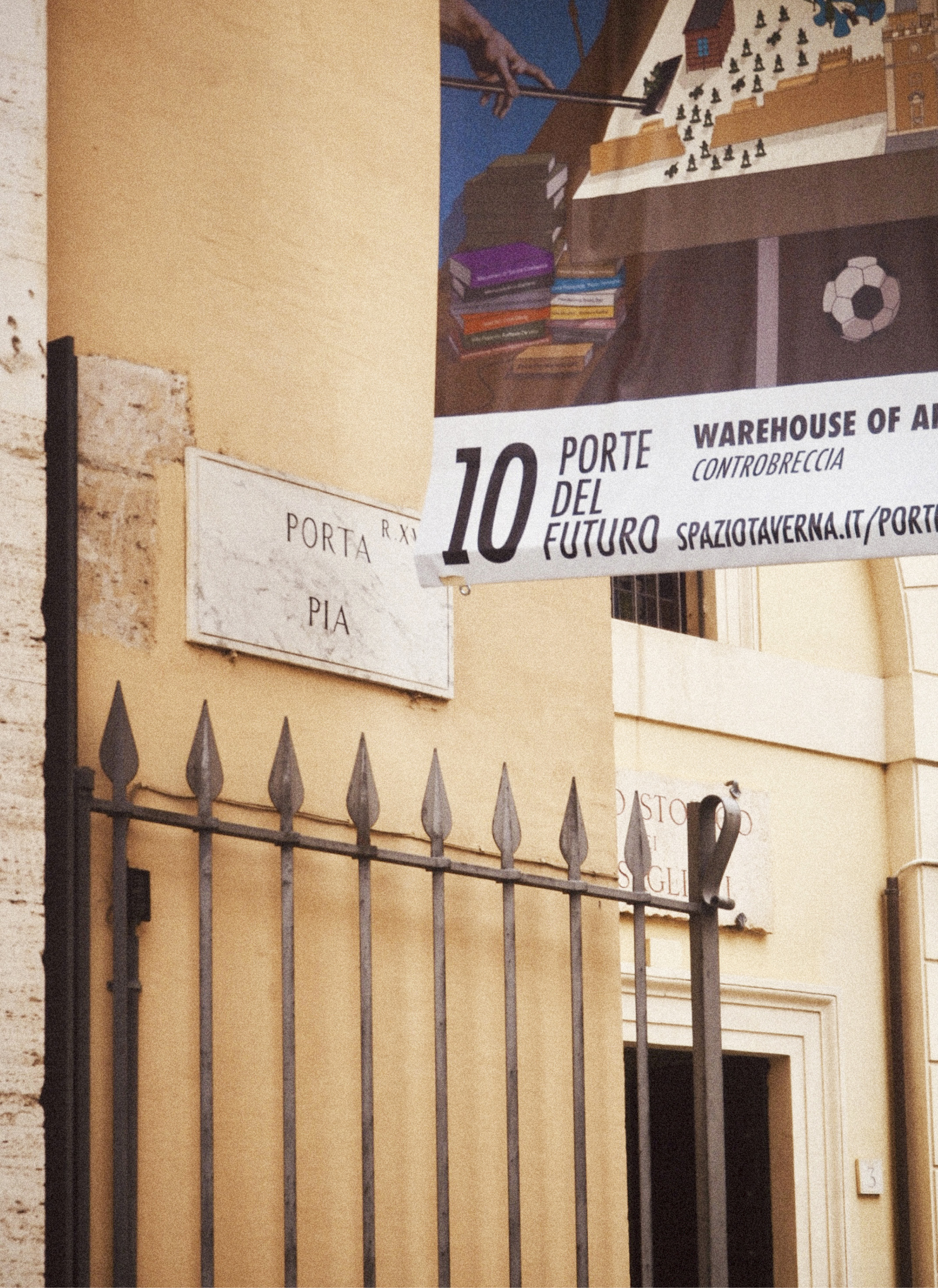 Fifty years after Christo’s intervention at Porta Pinciana, Spazio Taverna launches the project Le 10 porte del futuro (“The 10 Gates of the Future”), which involves the installation of two banners for each of the ten historic gates of the city: those by the artists placed at the entrance, and those by the architects at the exit. For the first time in history, the Aurelian Walls are transformed into an open-air art gallery. In this way, emerging artists and architects step out of their studios and museums to engage directly with the public.