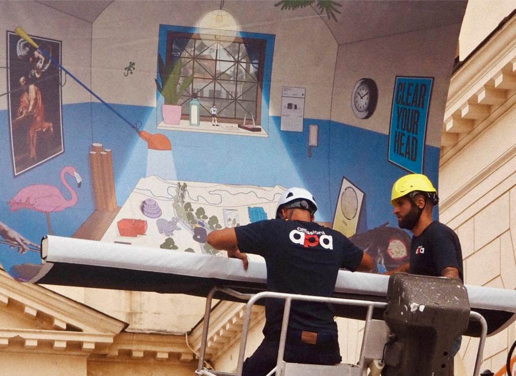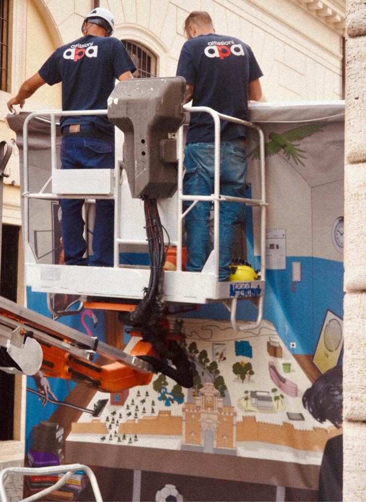 On ten historic gates of the Aurelian Walls, twenty banners featuring images of 21st-century Rome are displayed, created by 10 artists and 10 architectural studios from the latest generations.